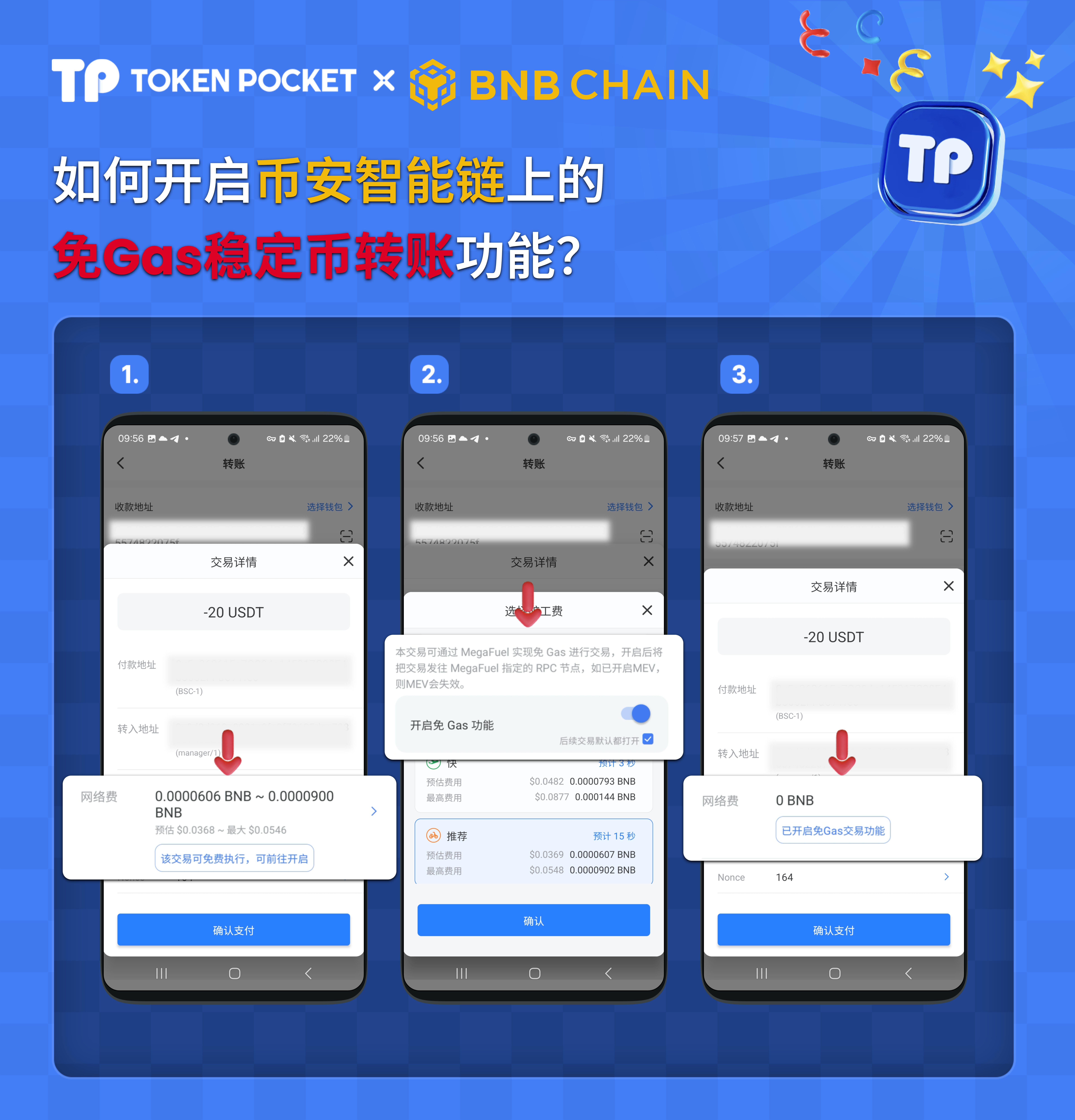 **TokenPocket（安卓2.3.6及以上版本，iOS2.5.4及以上版本）现已支持币安智能链上的免Gas稳定币转账功能，目前支持 USDT / USD1 两种稳定币转账。（每个地址每天可使用2次免Gas稳定币转账服务）**