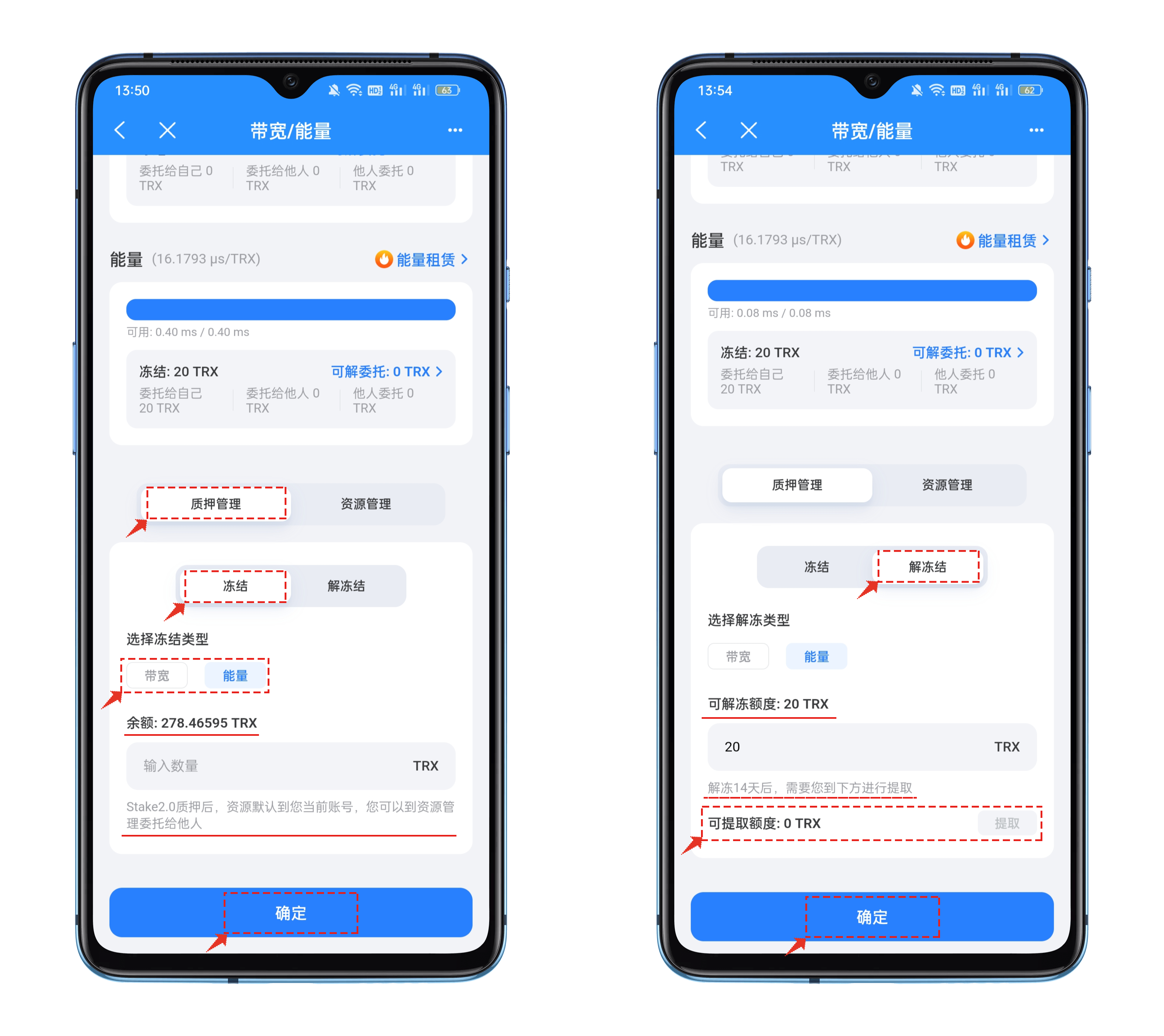 **解冻操作：**&#x5982;果冻结的资源没有进行其他操作，或者取回了委托给他人的质押后，在界面中可以看到【可解冻额度】的数量，将需要解冻的数量填入数量栏并执行操作后需要14天的时间才可以返回钱包，当时间到期后可以在【可提取额度】中进行提取操作，操作后Trx才会回到钱包地址中。