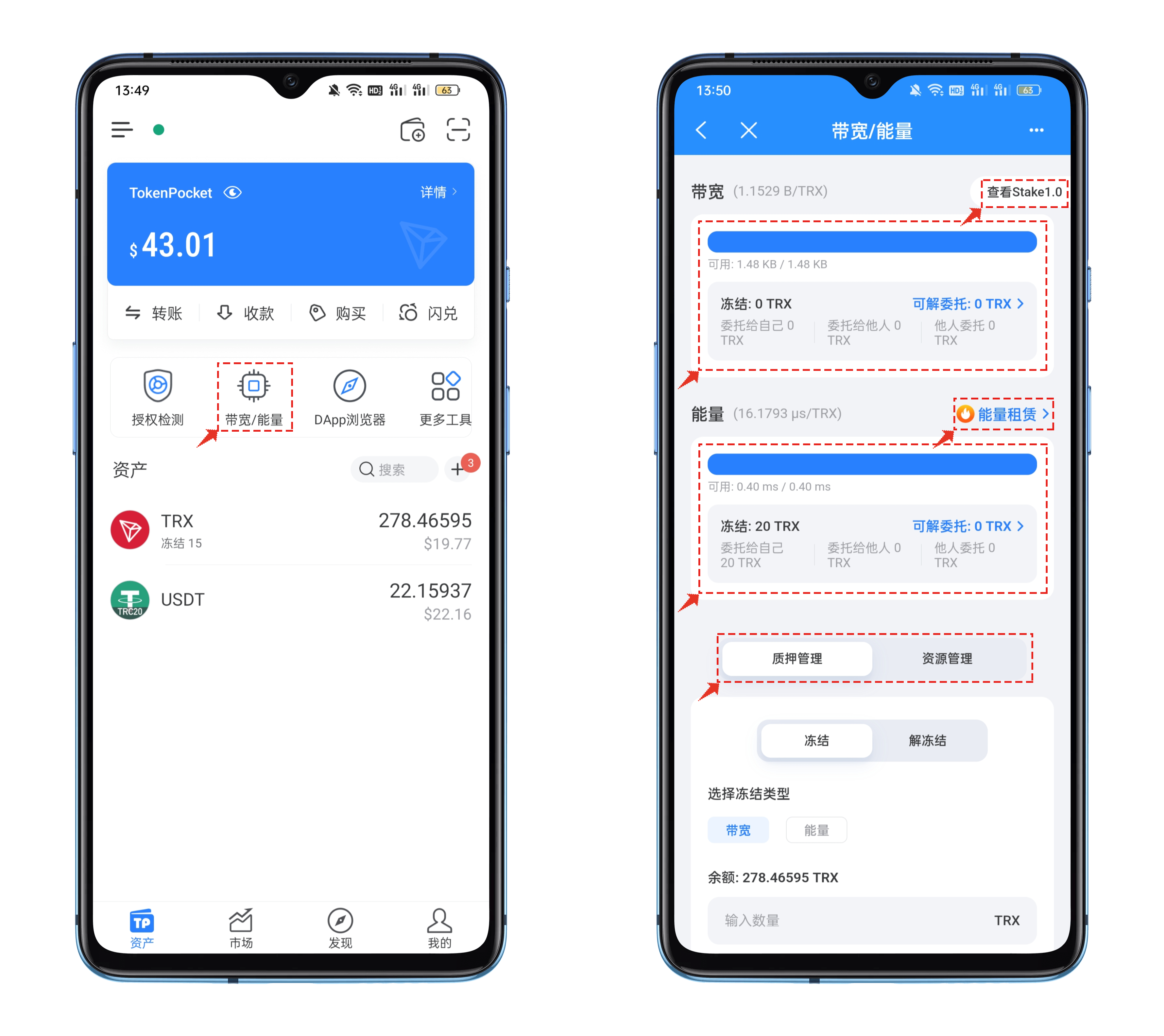 2、点击【质押管理】，可以选择【冻结】和【解冻】根据自己实际的带宽/能量的需求进行选择。