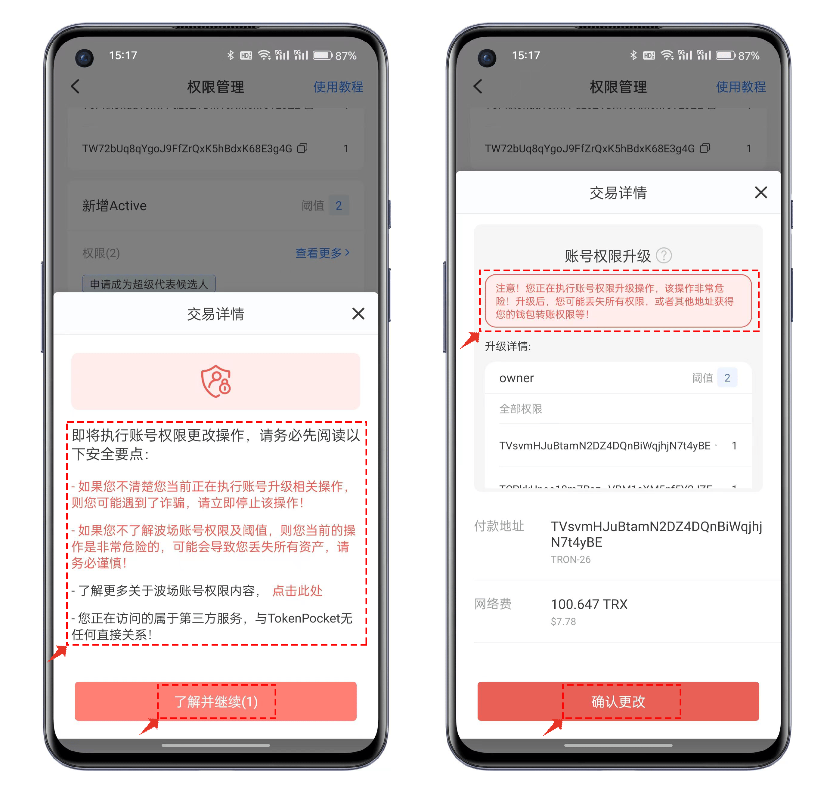3、确认好owner和active等参数都设置完毕后，点击底部的【确定升级权限】会弹出安全要点提示，重点要检查自己设置的阈值、权重、管理地址是否正确和合理，点击【了解并继续】后来到了最后的交易详情的执行界面，在这里依然可以在【升级详情】中确认执行的内容是否完整和正确，核对后点击【确定更改】并支付Gas（网络费）后就可以完成波场地址的权限变更操作。