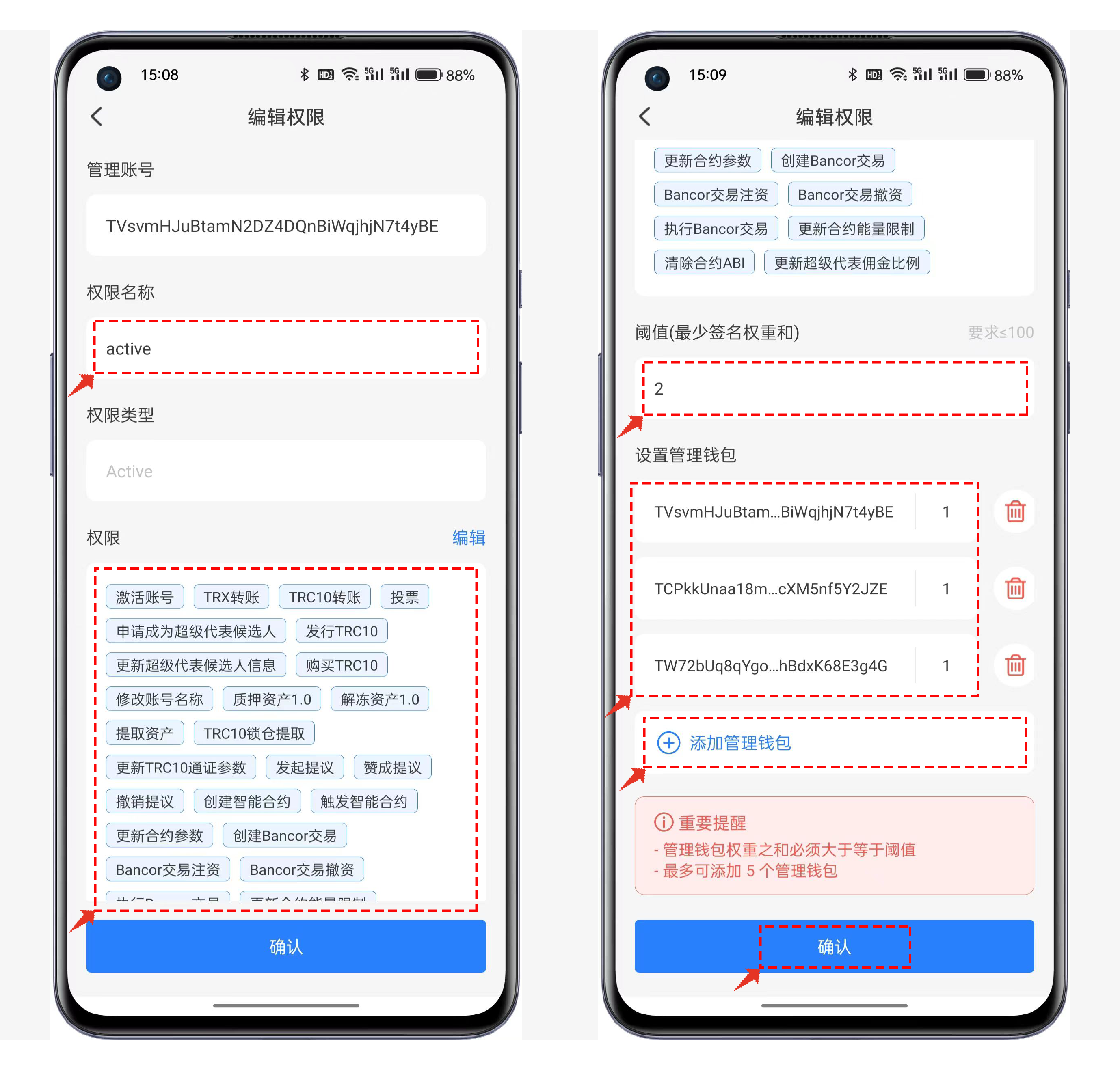 同样的active也可以直接替换权限地址（单签）也可以设置多个管理钱包(多签名)，设置合理的阈值和管理地址及权重能更安全更灵活的管理资产。设置好active的参数后即可点击底部的【确认】保存参数。