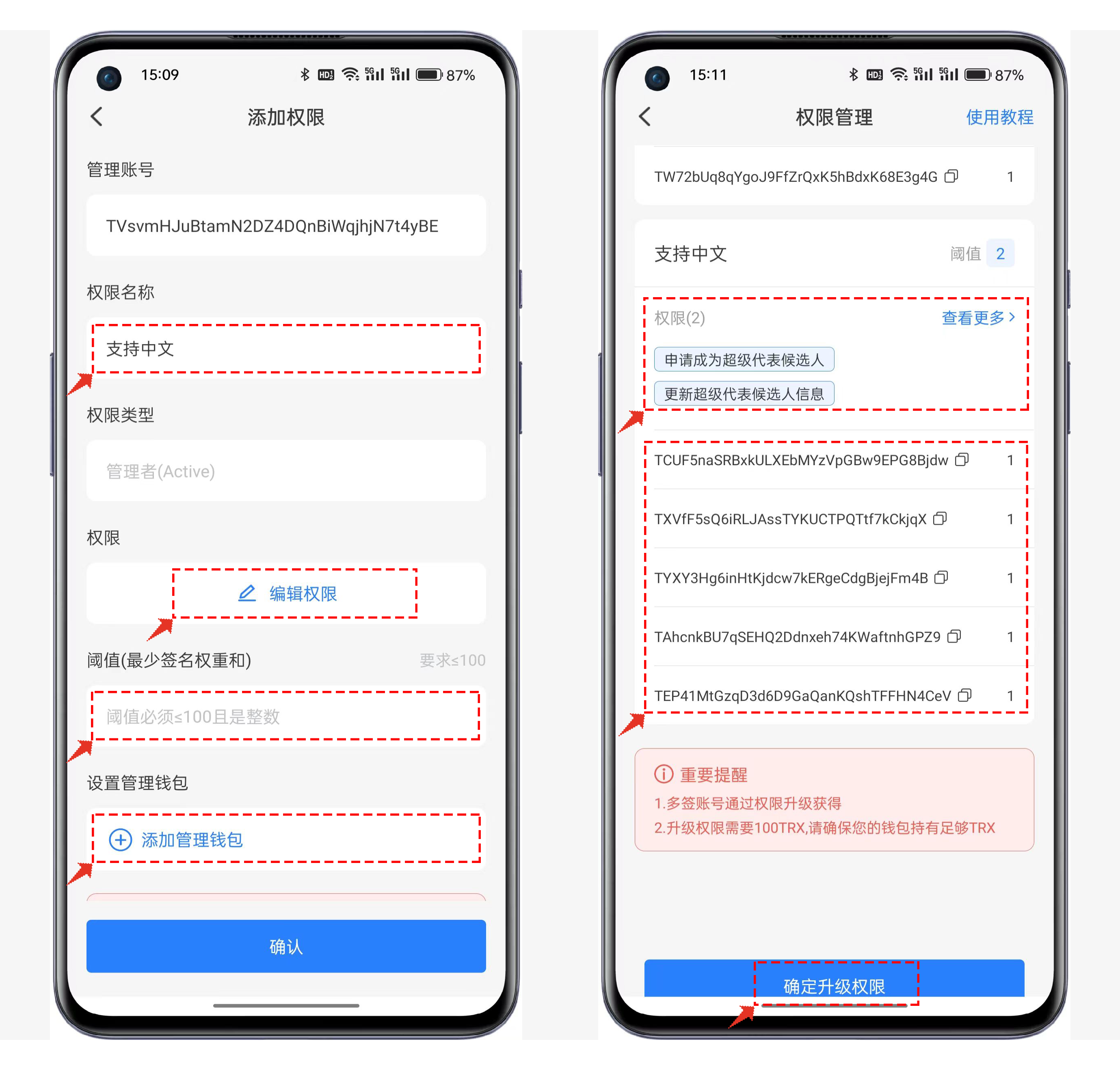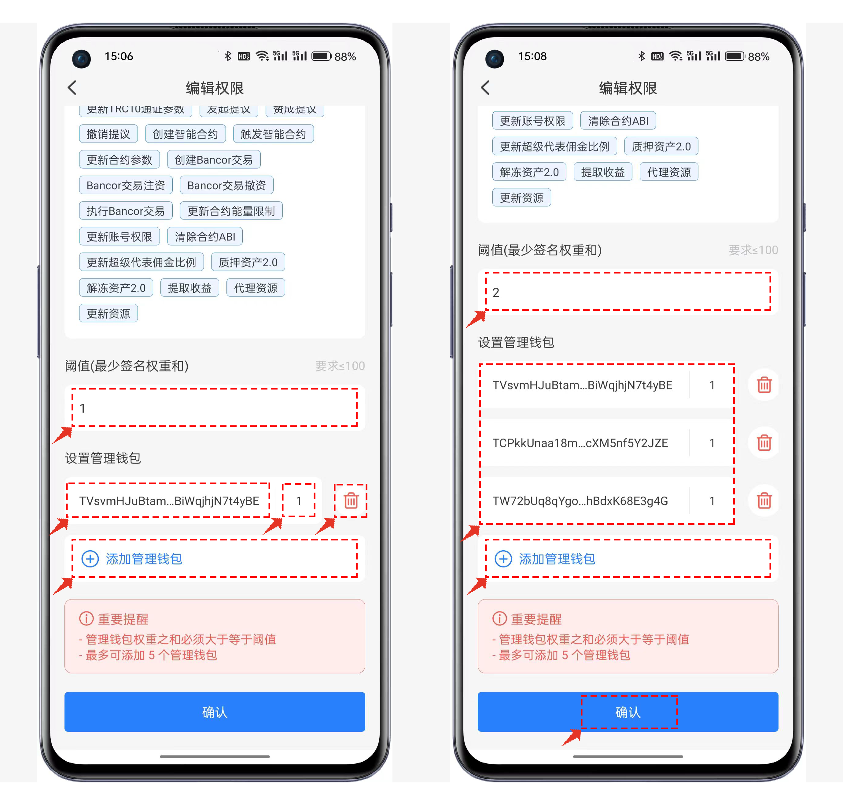 阈值、管理地址、权重要认真检查合理设置，一旦完成上链后是不可逆的操作；