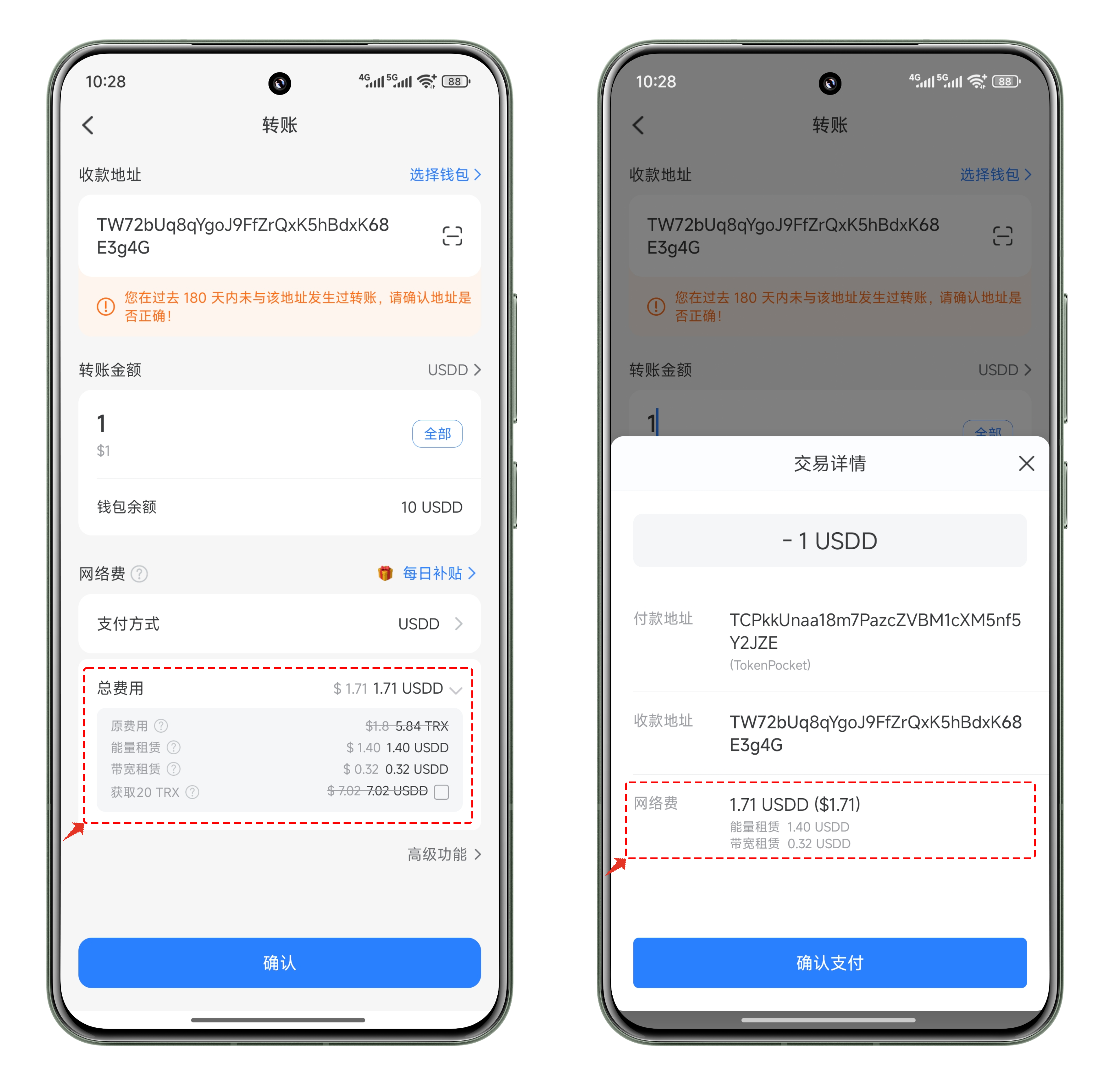3、选择 USDD 代付方式后，就可以看到详细的租赁界面，里面包含了对带宽和能量的租赁参数，还可以勾选购买20 TRX ；确认后，在交易详情界面可以看到网络费内容已经变成了 USDD ，最后点击\[确认支付]即可执行上链操作。