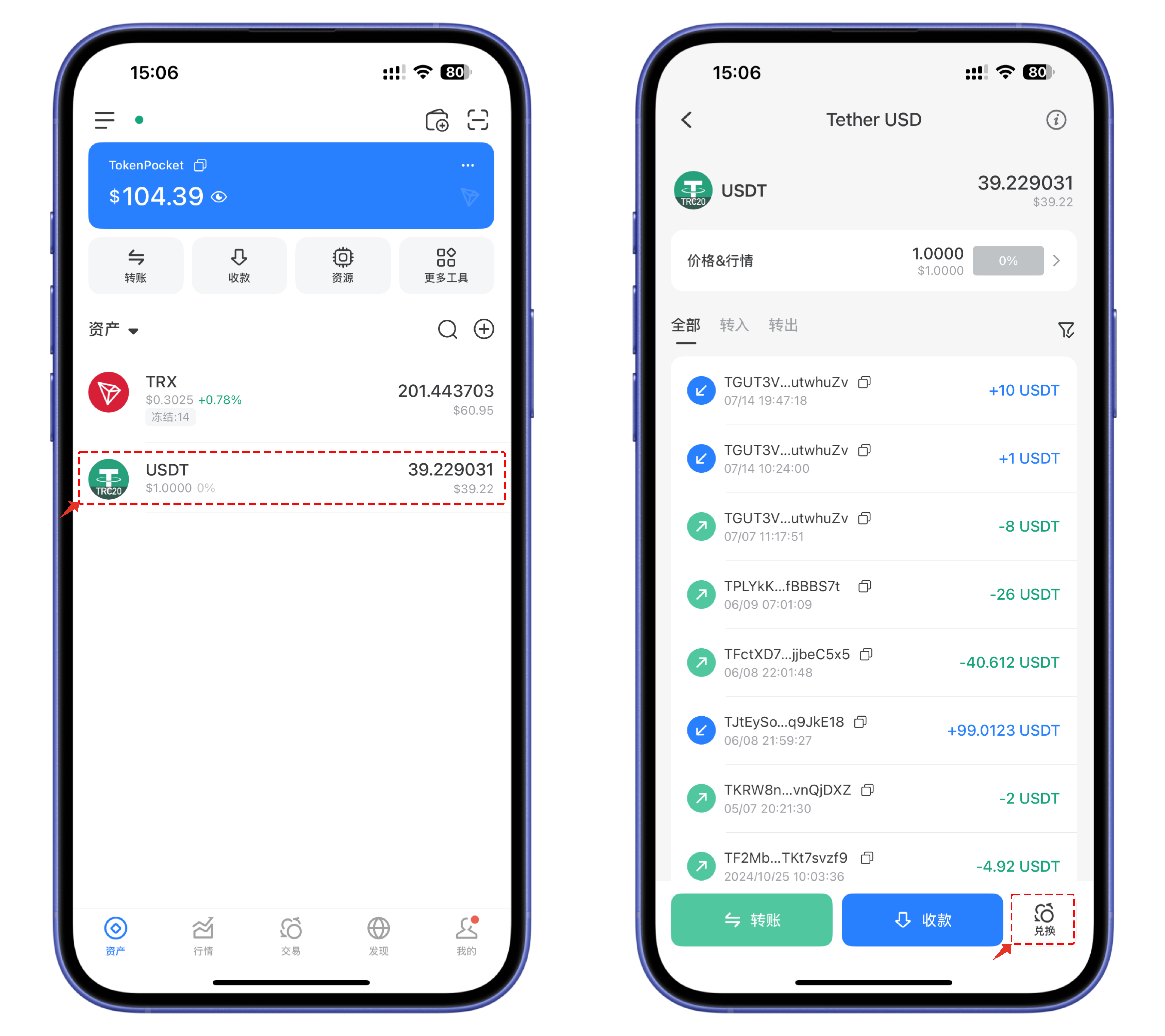 1、打开 TokenPocket 点击需要兑换的代币 USDT。在界面右下角位置点击\[兑换]。
