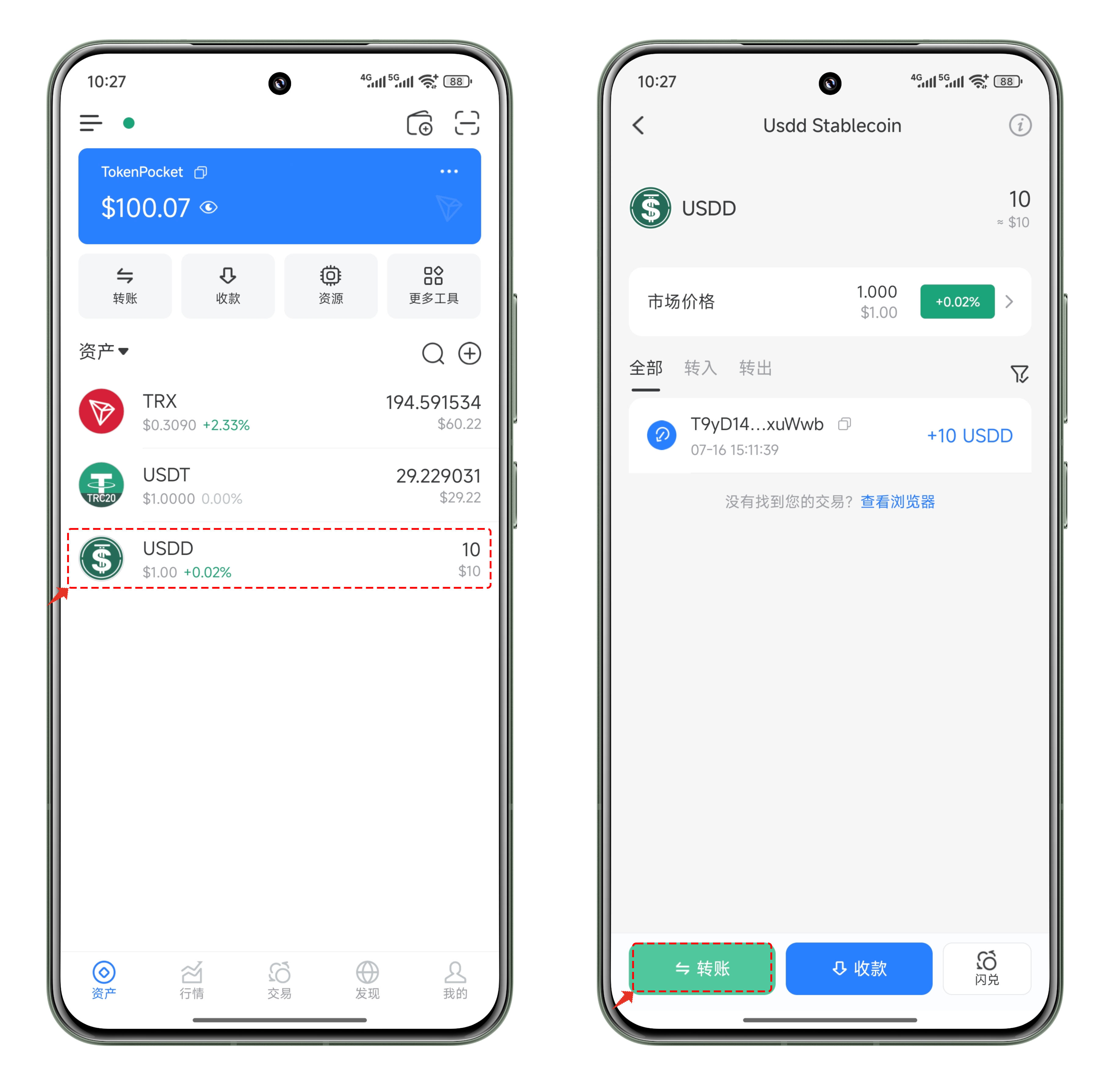 1、打开 TokenPocket，点击需要转账的代币，例如\[USDD]，代币界面点击左下角\[转账]。