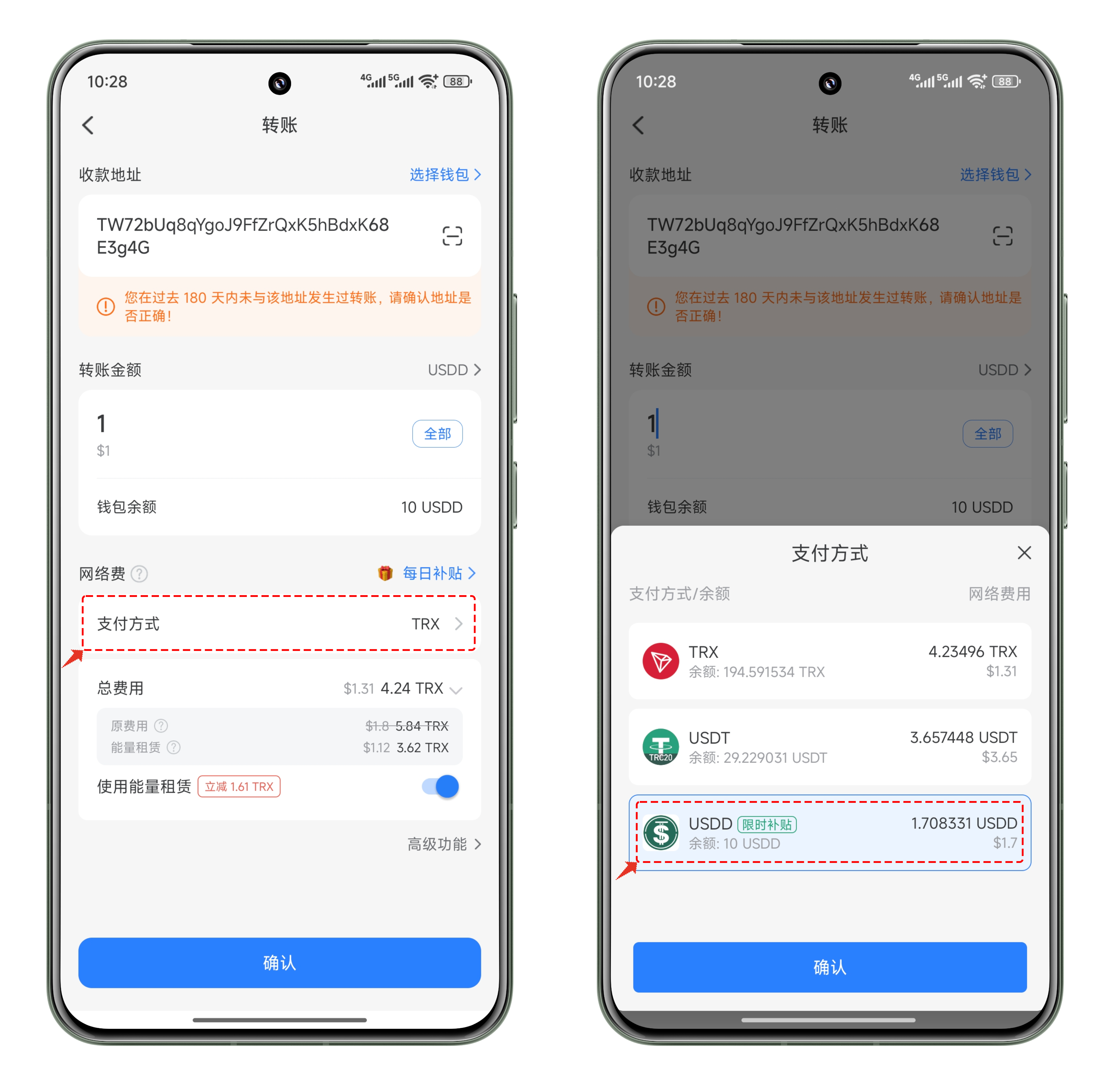 2、转账界面中，默认支付方式是 TRX，如果使用 TRX 支付，请勾选能量租赁功能。 点击\[支付方式]，选择 USDD 付款方式，现在还有限时补贴，转账费用非常划算。