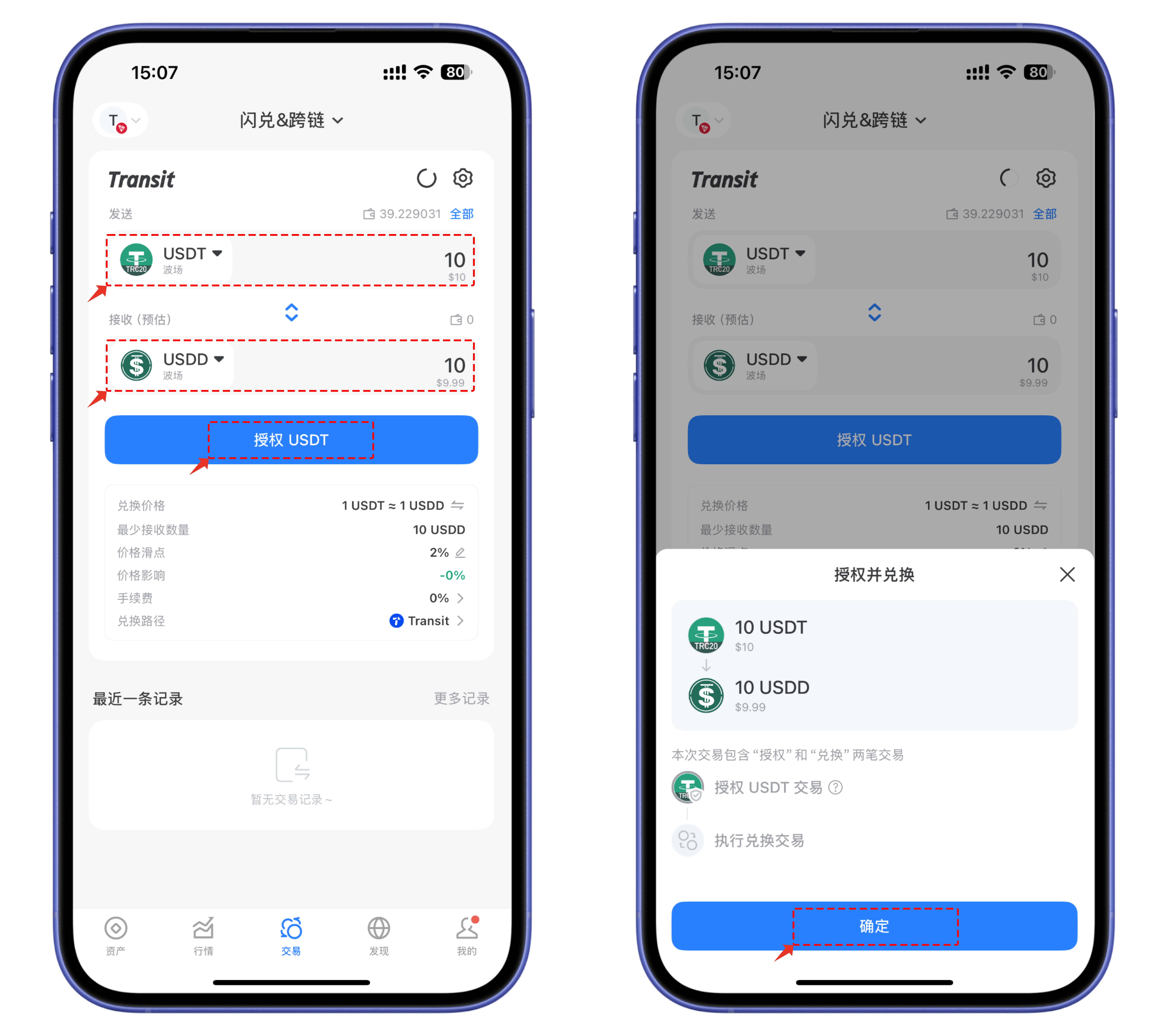 2、兑出选择 USDT，兑入代币选择 USDD，设置好需要兑换的数量，点击【授权 USDT】。因为是首次执行对 USDT 的调用，所以会需要2个步骤，先进行授权再进行兑换。