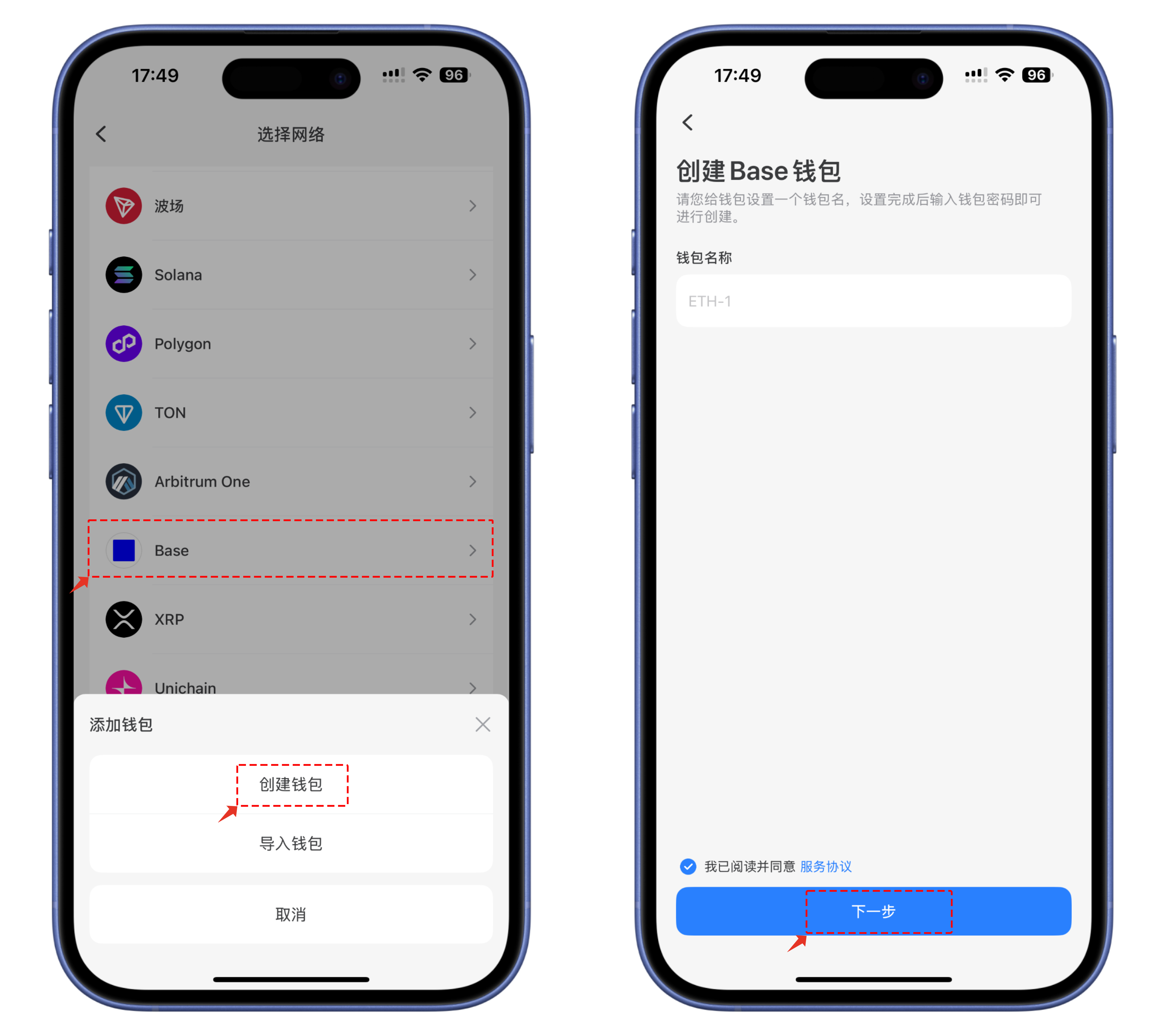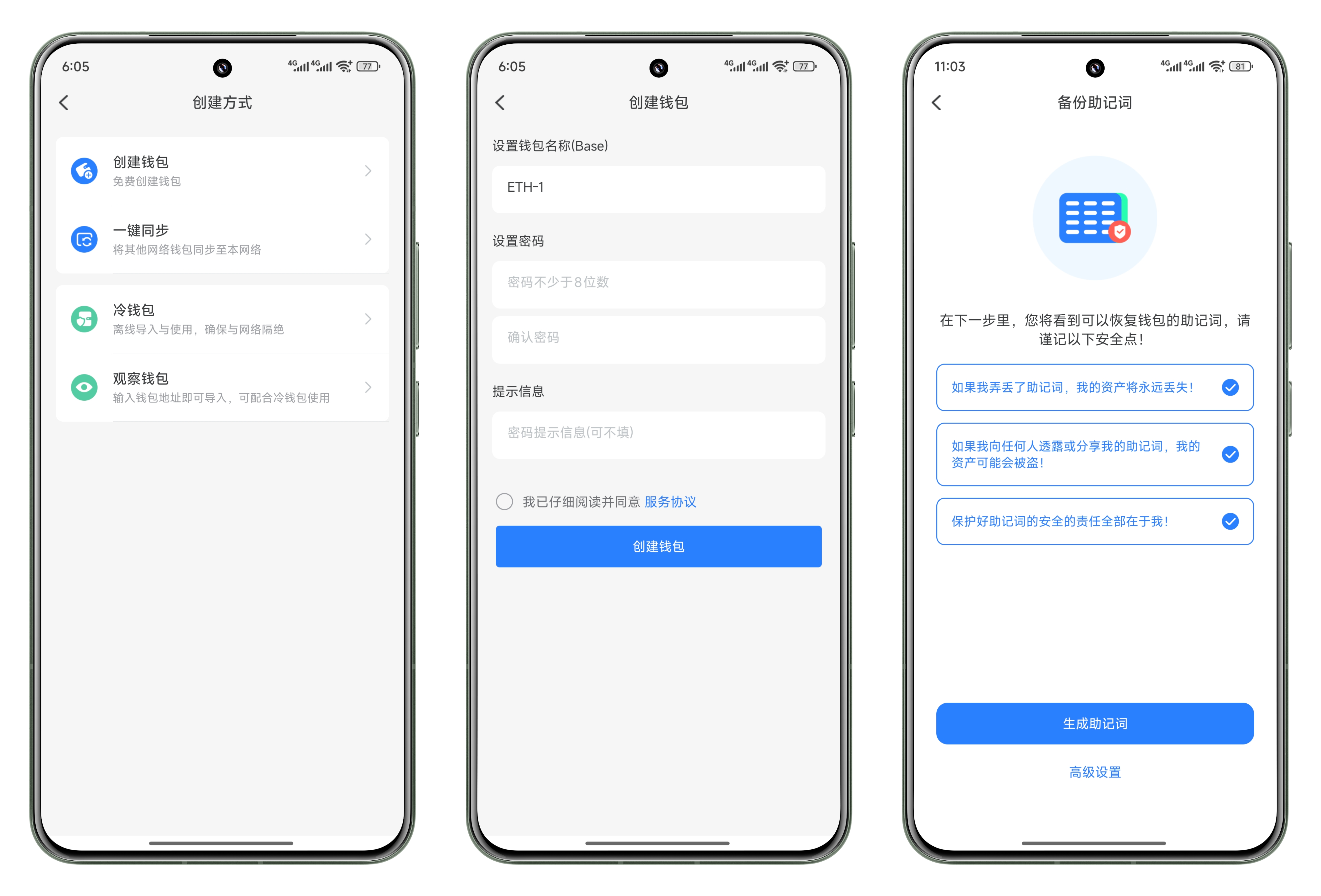 2、<mark style="color:purple;">(安卓版本)</mark> 选择 Base 公链，点击\[创建钱包]，设置名称和密码（密码只对于本地设备有效），然后点击\[创建钱包]；请一定使用离线的方式来对密钥进行备份。