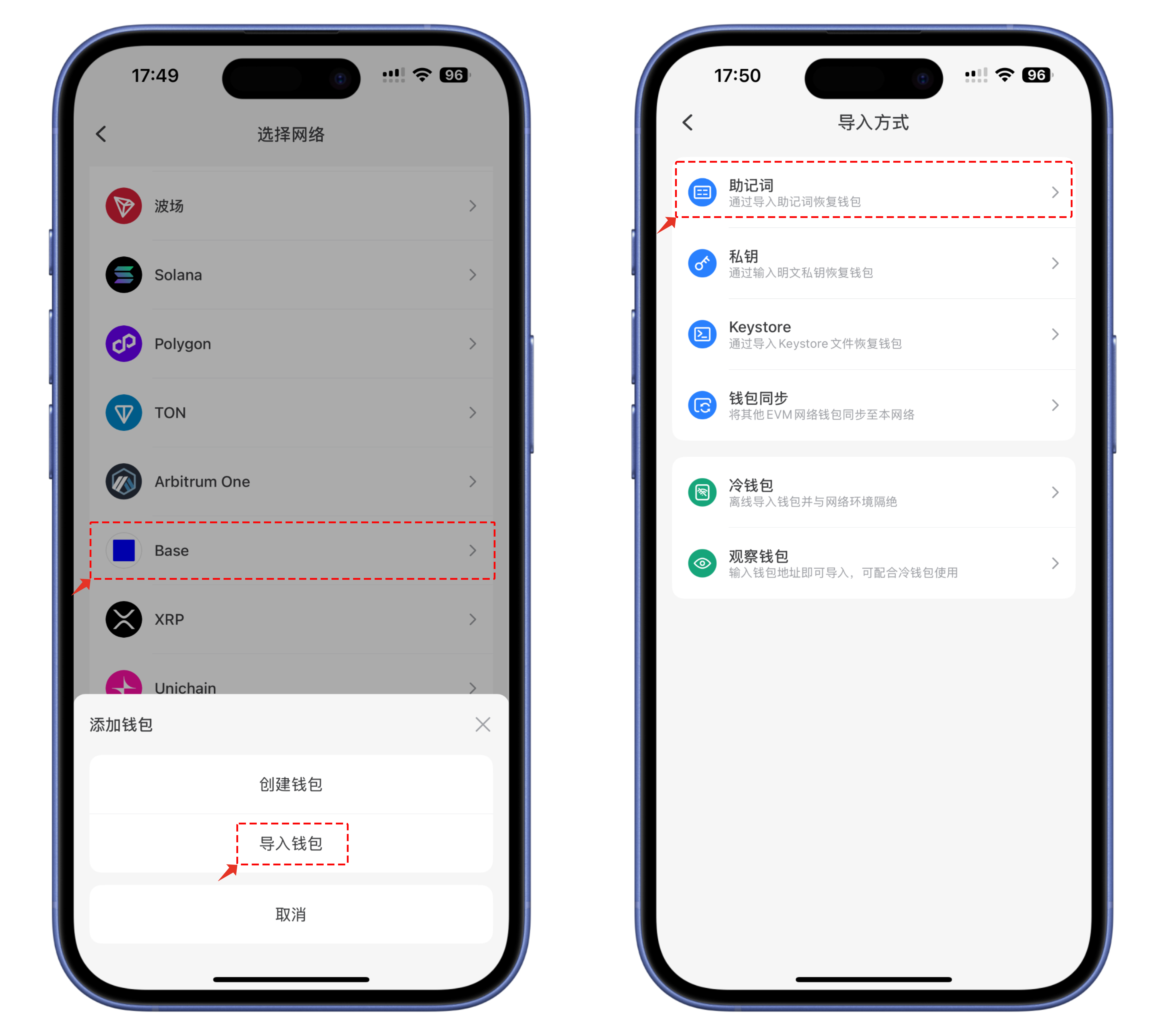 2、点击 Base 公&#x94FE;**，**&#x70B9;&#x51FB;**【导入钱包】，**&#x9009;择导入方式;（以助记词导入为例）