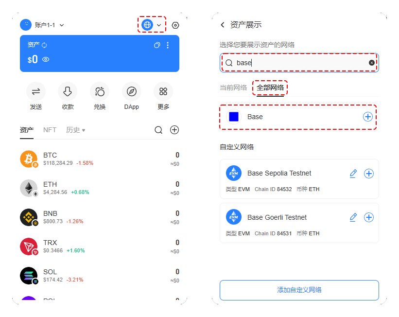 TokenPocket 插件钱包默认创建的是多链钱包，其中就包含了 Base 公链，点击右上角的网络选择，选择\[全部网络]搜索 Base 公链，就可以添加 Base 钱包。&#x20;