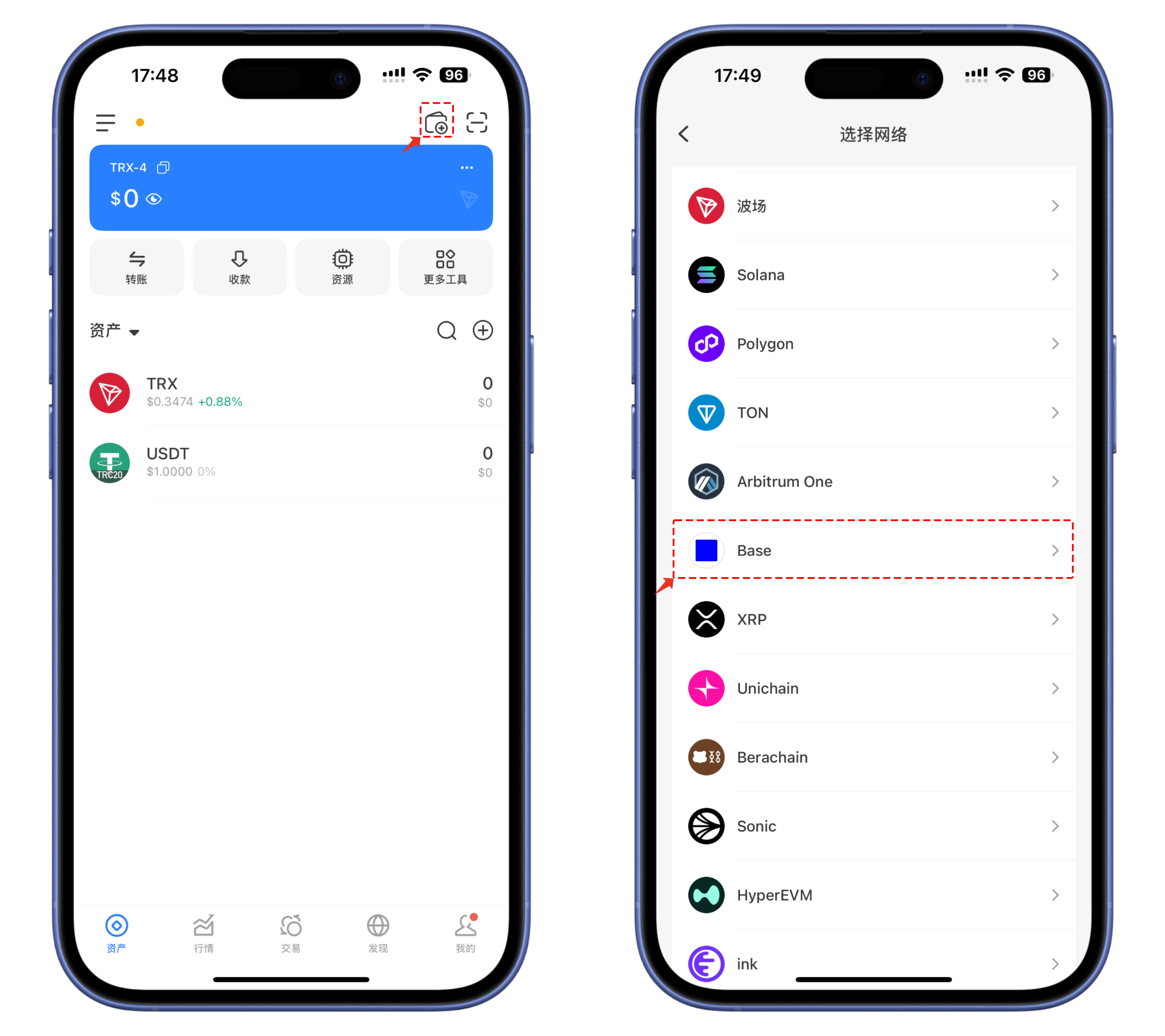 1、打开 TokenPocket APP，点击右上角![](https://help.tokenpocket.pro/~gitbook/image?url=https%3A%2F%2F261497644-files.gitbook.io%2F%7E%2Ffiles%2Fv0%2Fb%2Fgitbook-x-prod.appspot.com%2Fo%2Fspaces%252F-MMF2k4MCaxErpZyah2d%252Fuploads%252FioAtG3c3vksPagygLtd1%252Fimage.png%3Falt%3Dmedia%26token%3Db5023fb5-a27c-49a5-b40a-ac84a26eb00f\&width=300\&dpr=4\&quality=100\&sign=7d6af2c1\&sv=1)，添加钱包；在列表中选择 Base 公链。