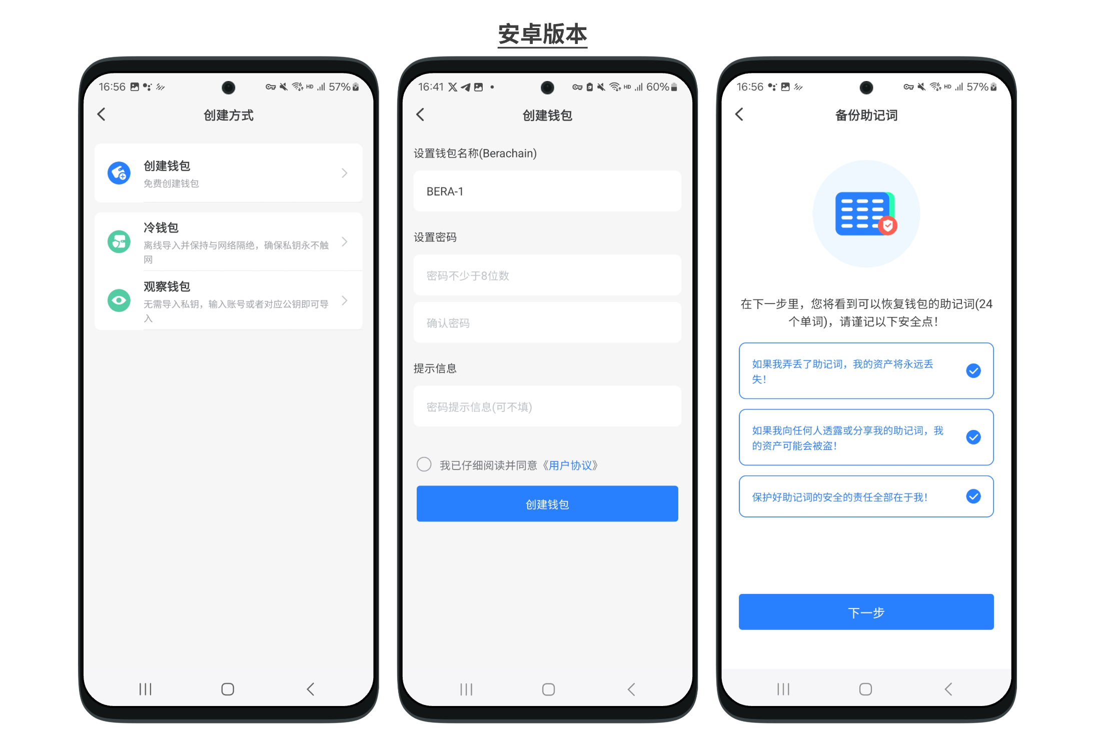 2、<mark style="color:purple;">(>安卓版本)</mark> 点击**Berachain，**&#x70B9;&#x51FB;**【创建钱包】，**&#x7EE7;续点&#x51FB;**【创建钱包】**;