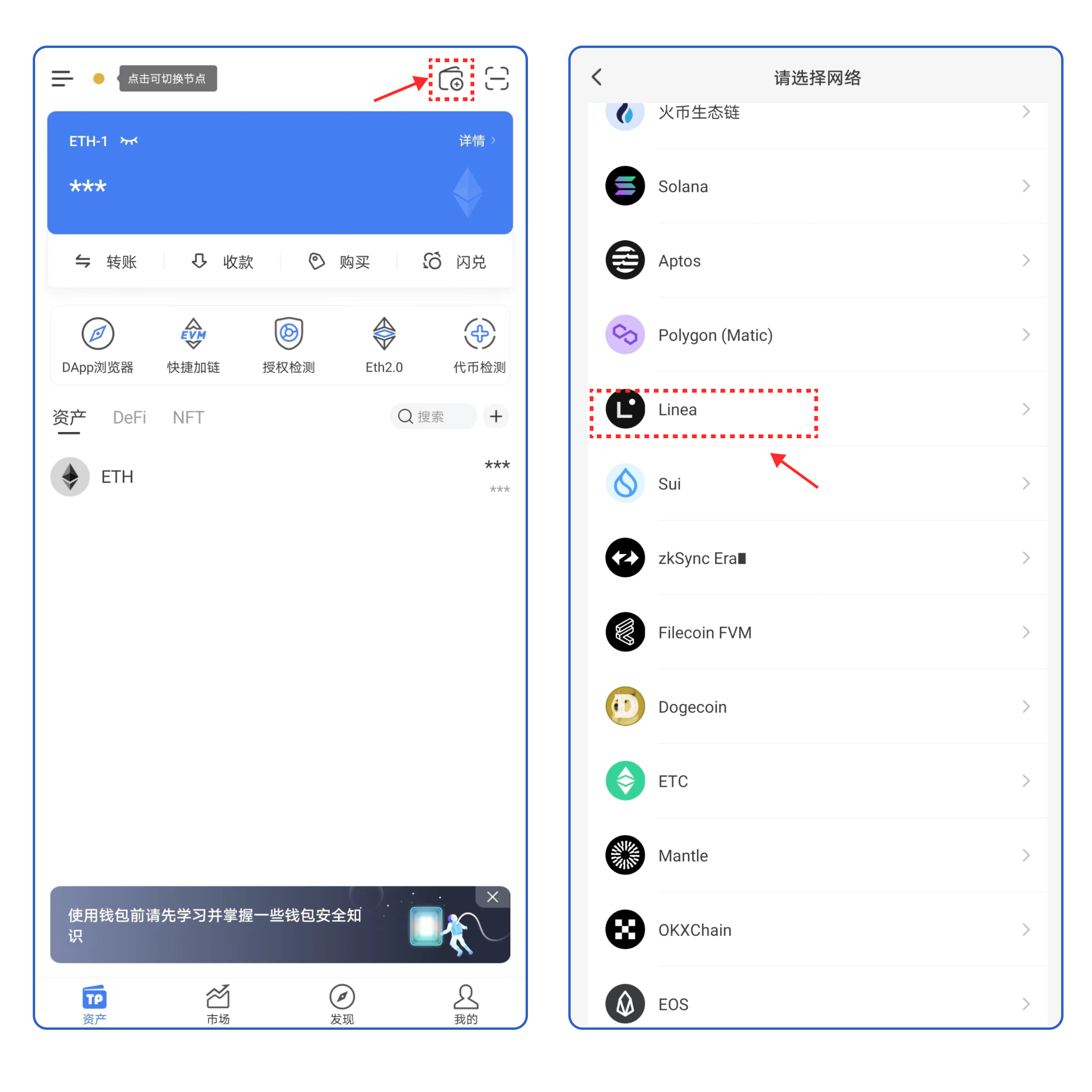 1、打开TokenPocket App，点击右上角![](https://261497644-files.gitbook.io/~/files/v0/b/gitbook-x-prod.appspot.com/o/spaces%2F-MMF2k4MCaxErpZyah2d%2Fuploads%2FVVdVT1C0dBJOJYHFZoJn%2Fimage.png?alt=media\&token=4cb92c91-451b-41bc-84ab-42c9f2db88f8)，然后选择**Linea**;