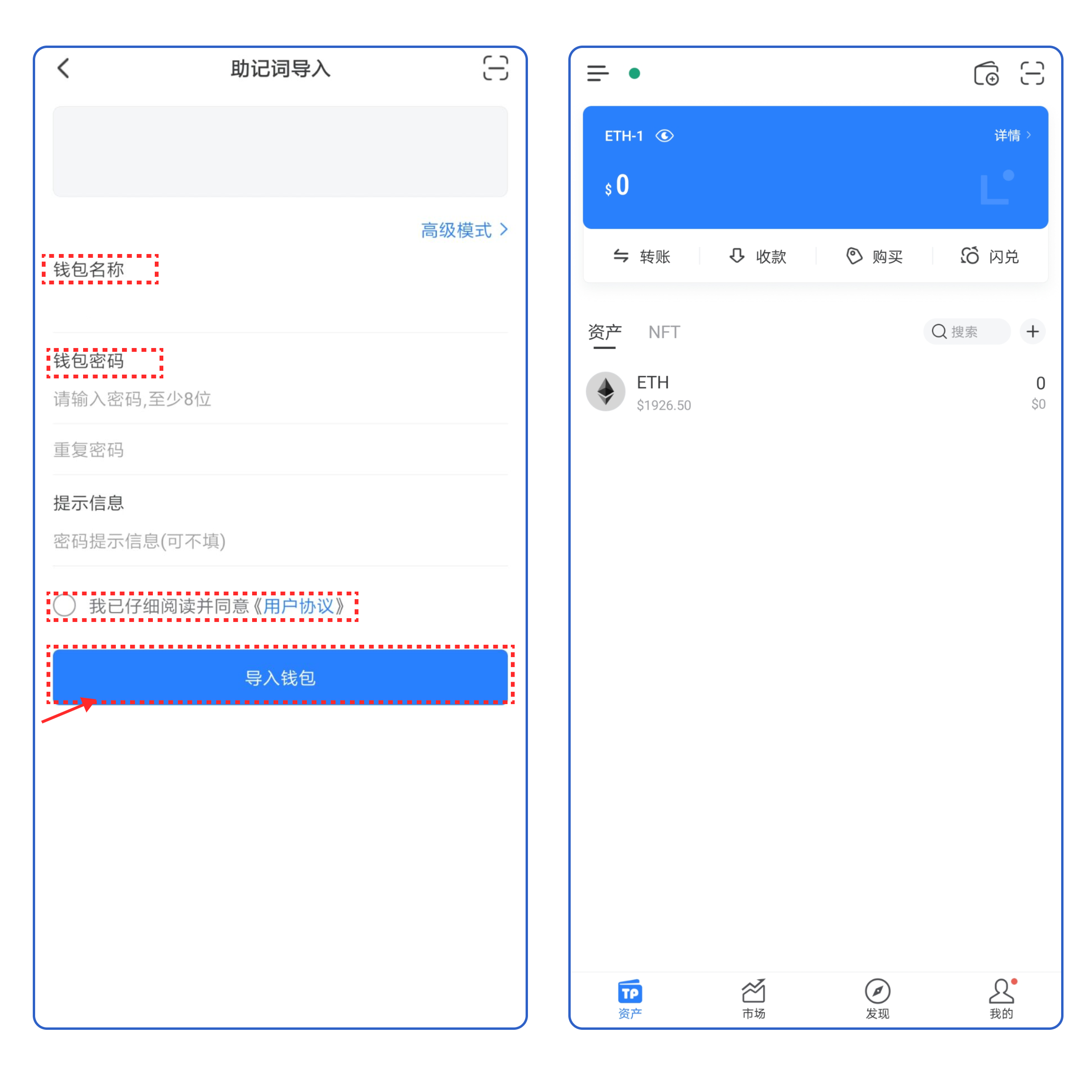 3、以助记词导入为例，输入备份&#x7684;**【助记词】**&#x53CA;**【钱包名称】**、**【密码】**，勾&#x9009;**【服务及隐私条款】**；点&#x51FB;**【导入钱包】**；至此，你已经成功导入**Linea**钱包。
