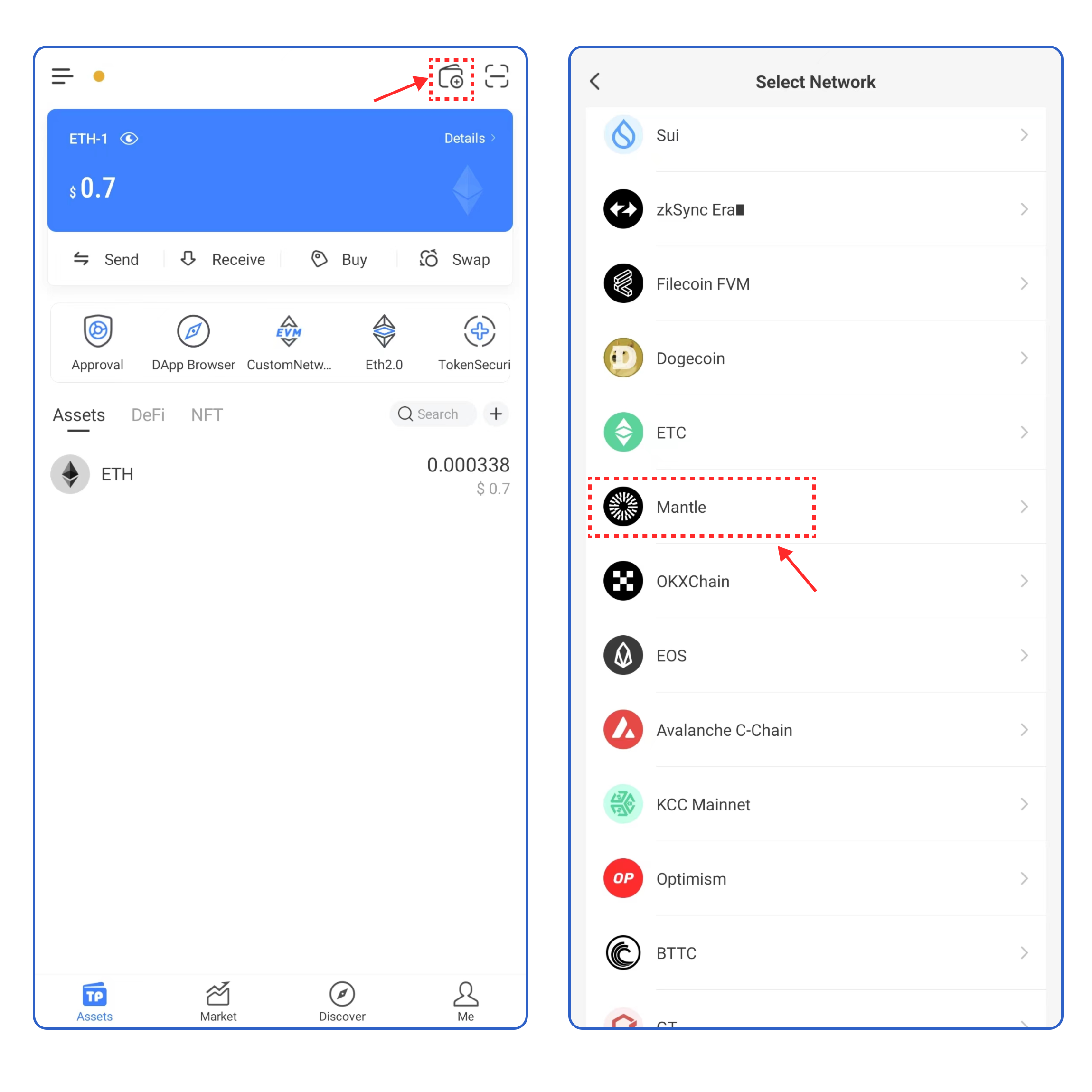 1、打开TokenPocket APP，点击右上角![](https://261497644-files.gitbook.io/~/files/v0/b/gitbook-x-prod.appspot.com/o/spaces%2F-MMF2k4MCaxErpZyah2d%2Fuploads%2FXR9vDnVMpwa11pnlwx5t%2Fimage.png?alt=media\&token=b30a0f86-a0fa-4396-809f-8f21bb55f430)，然后选择**Mantle;**