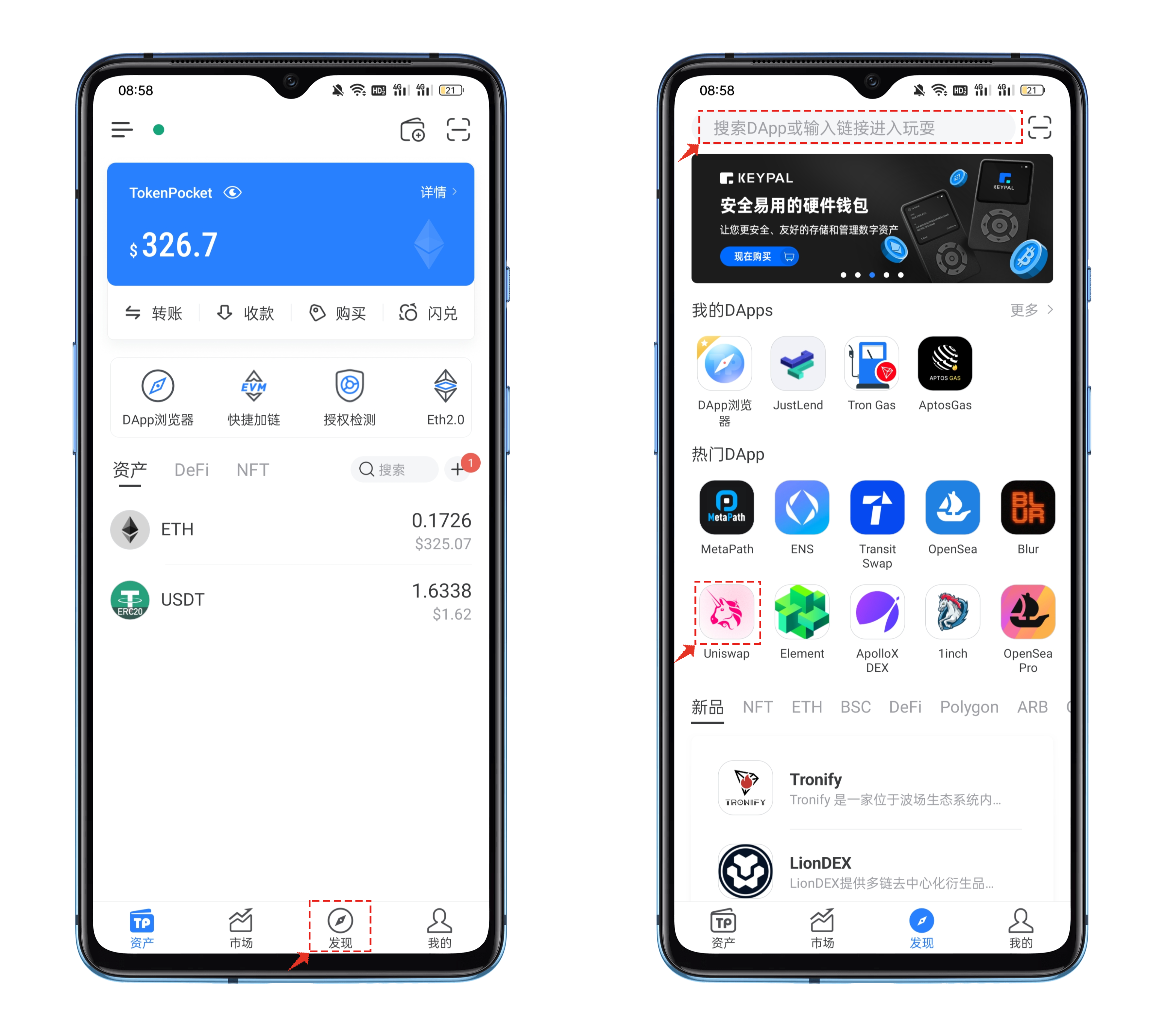 1、打开TokenPocket，点击【发现】进入发现界面后在推荐位中打开或点击顶部，搜索Uniswap。
