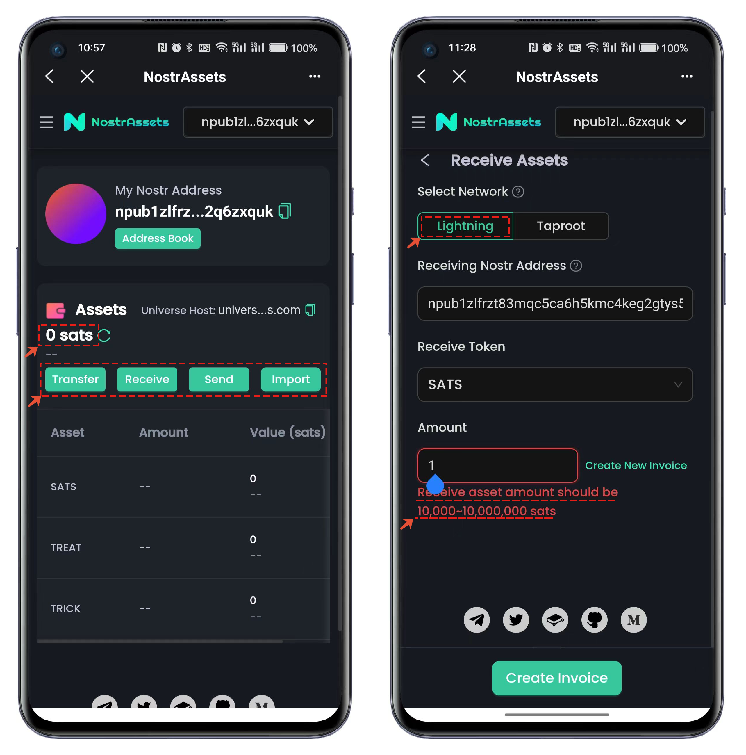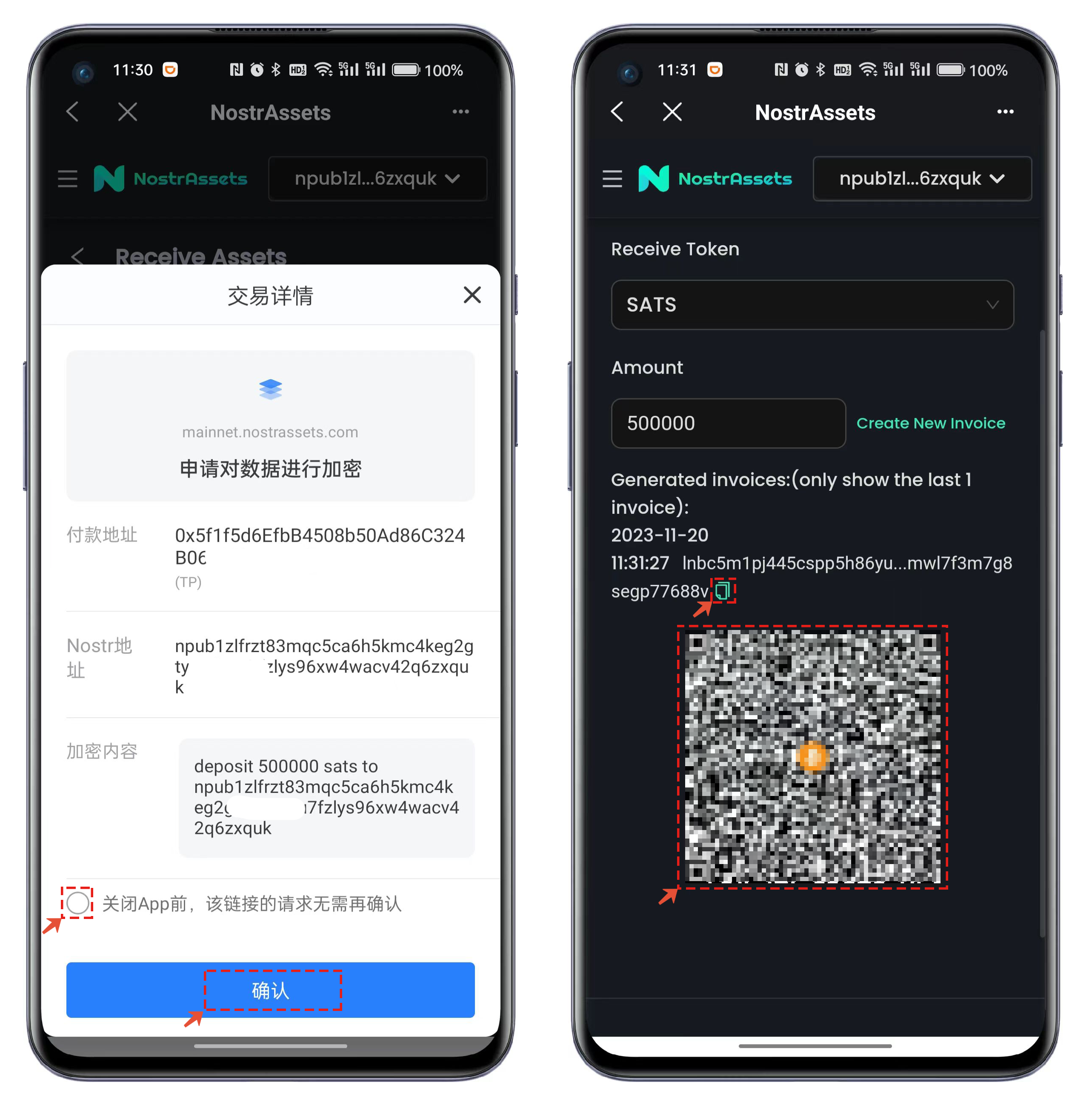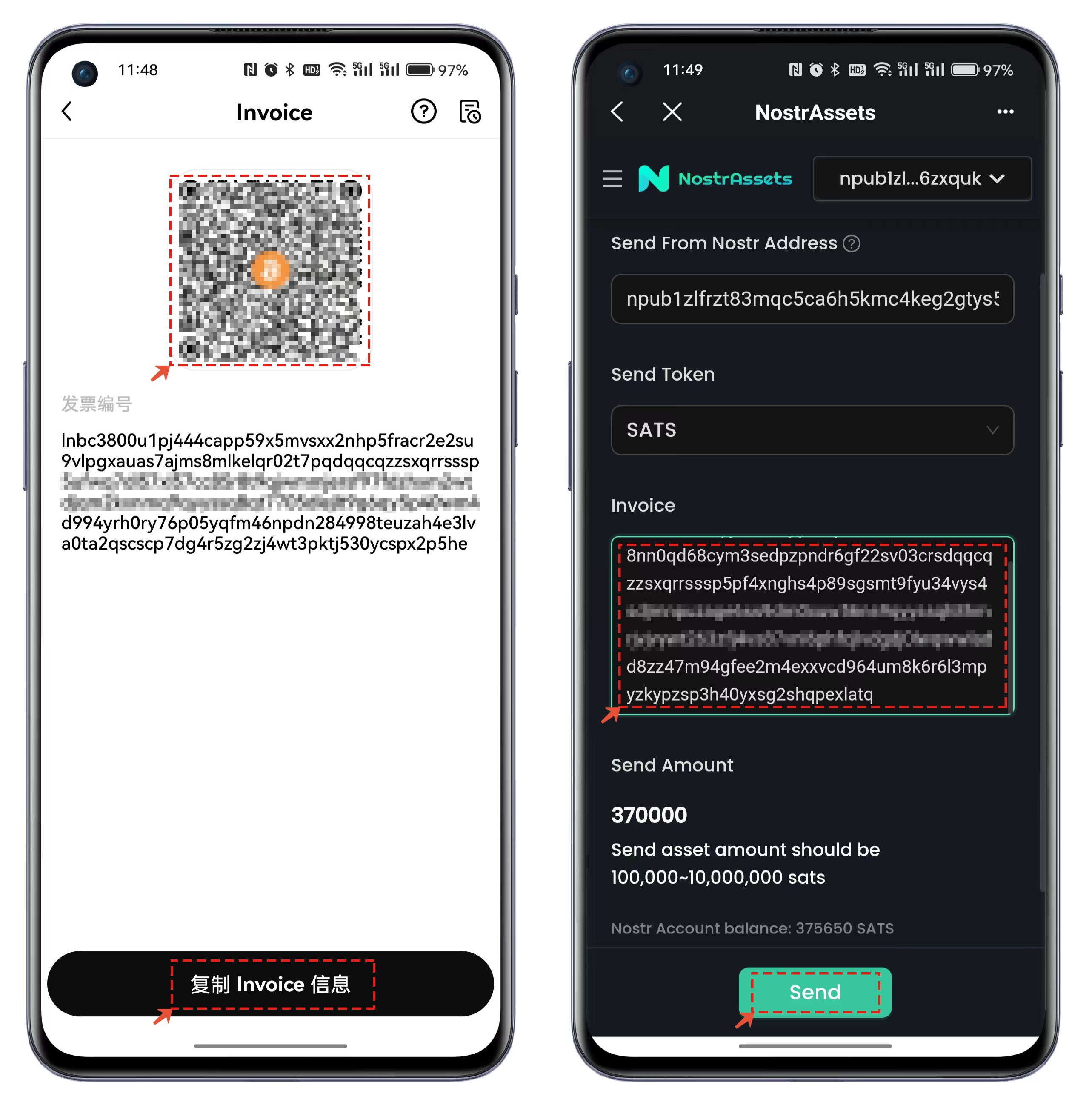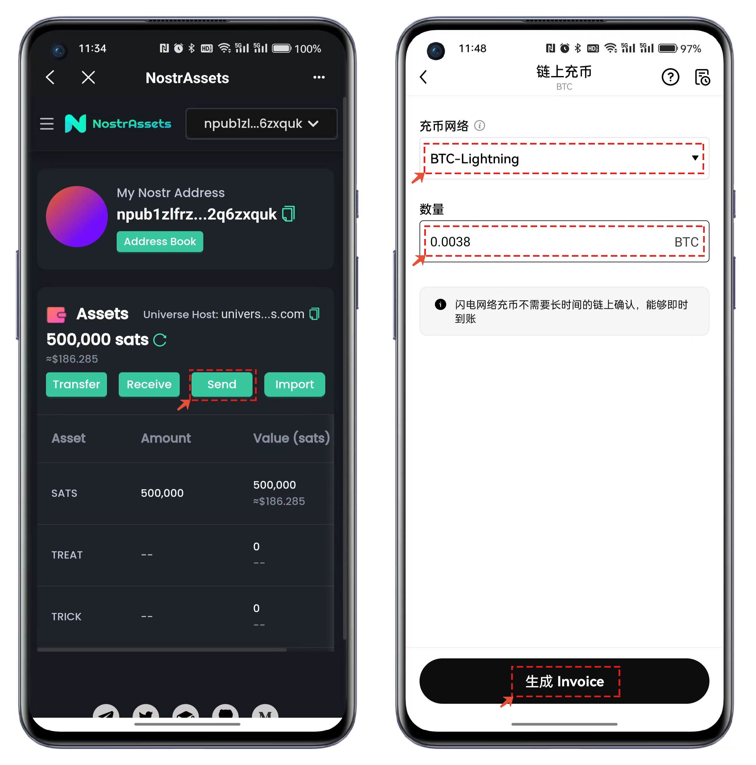10、点击【生成 Invaice】会生成充值的发票数据，复制发票地址填写到**N**ostr Assets的界面中并点击【Send】即可完成充值到交易所的操作流程。