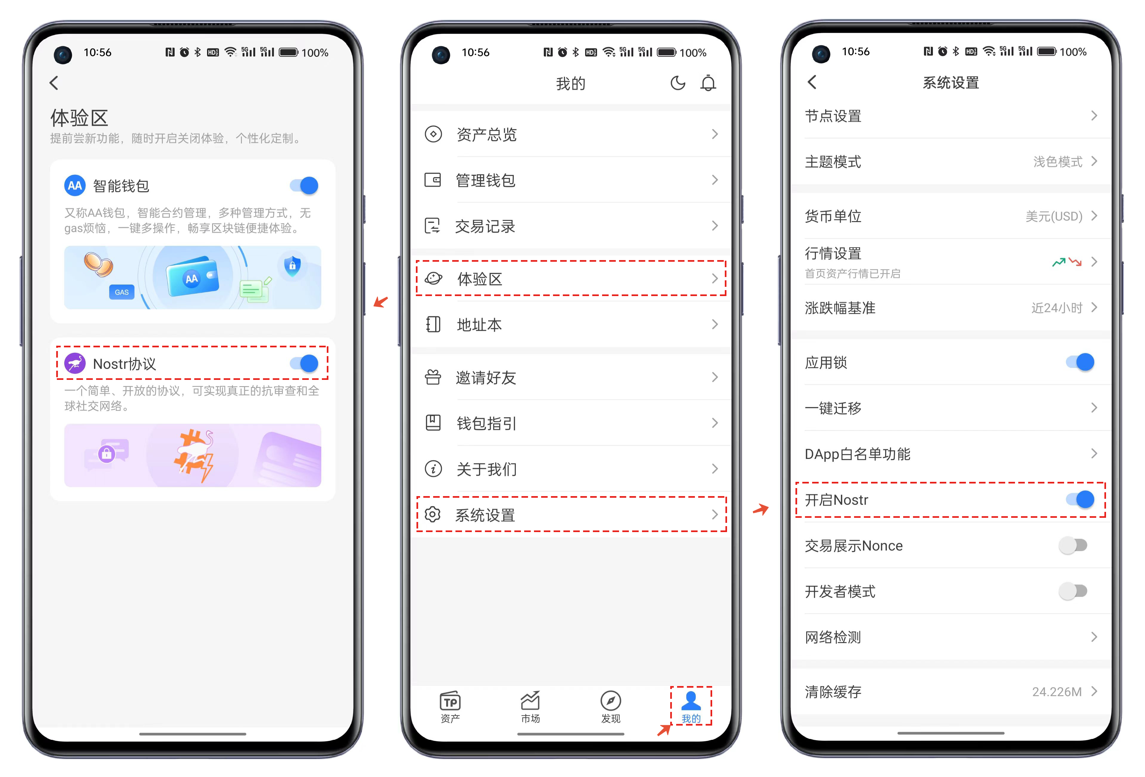 打开TokenPocket，点击【我的】可以通过两个入口开启Nostr协议。入口一：点击【体验区】勾选Nostr协议，入口二：点击【系统设置】勾选Nostr协议。