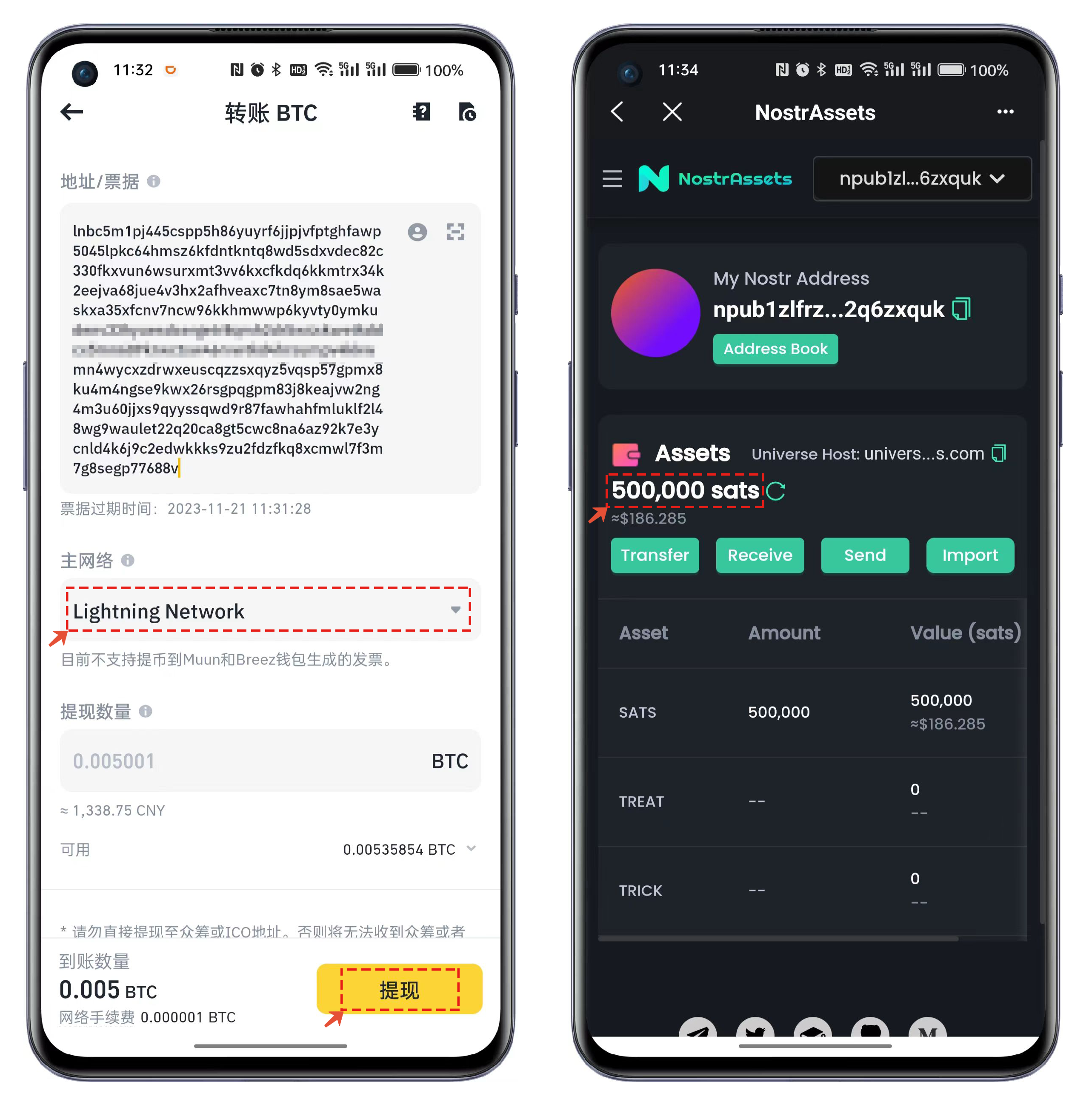 5、将发票地址填入到交易所提币的界面中，请务必选择使用【Lightning】闪电网络进行操作。提币完成后稍等片刻即可收到提取的sats资产。