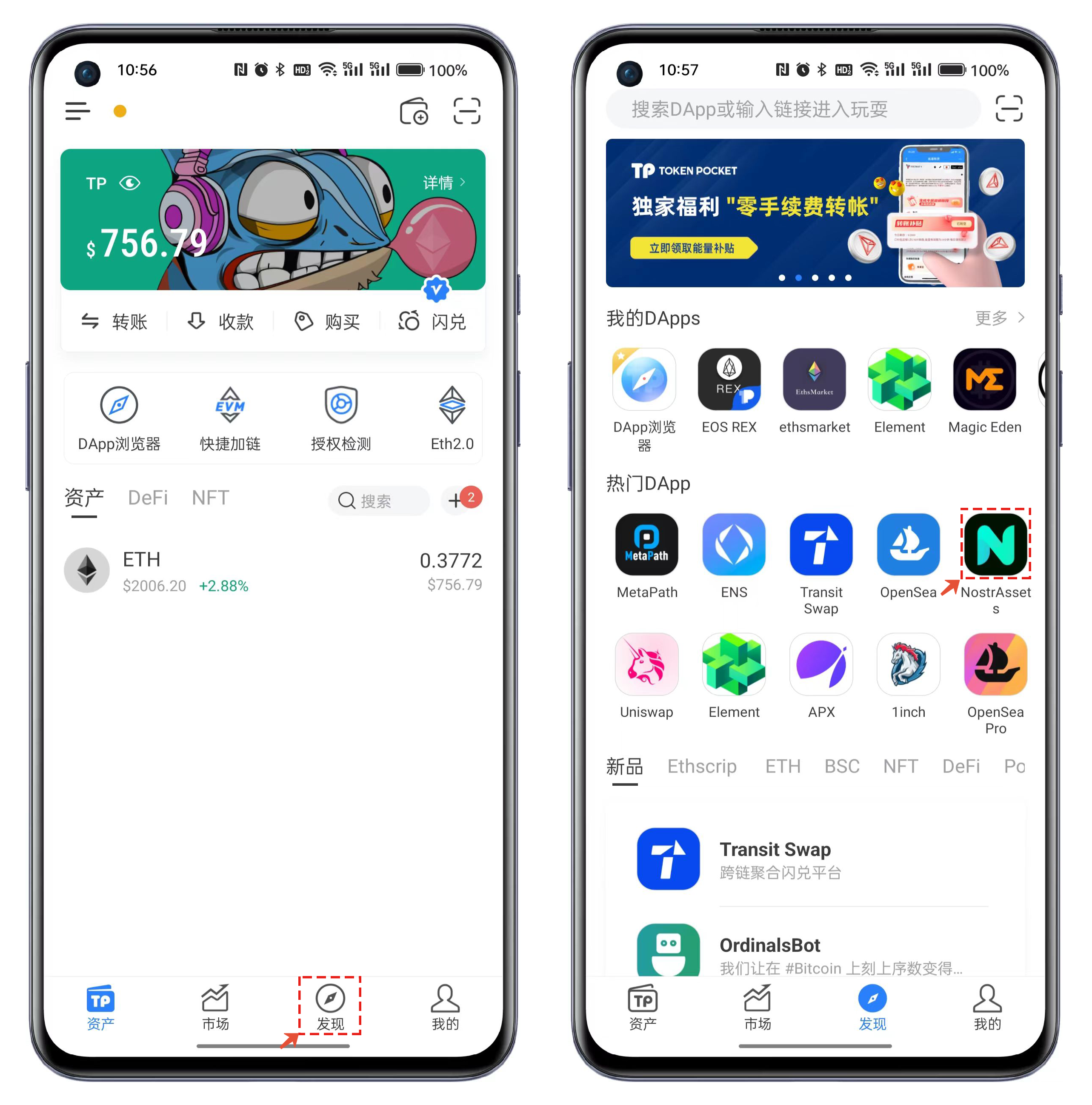 TP Wallet用户可以通过【发现】菜单中搜索NostrAssets，或者直接通过DApp浏览器打开链接： [<mark style="color:blue;">**https://mainnet.nostrassets.com/?utm\_source=tokenpocket**</mark>](https://mainnet.nostrassets.com/?utm_source=tokenpocket)