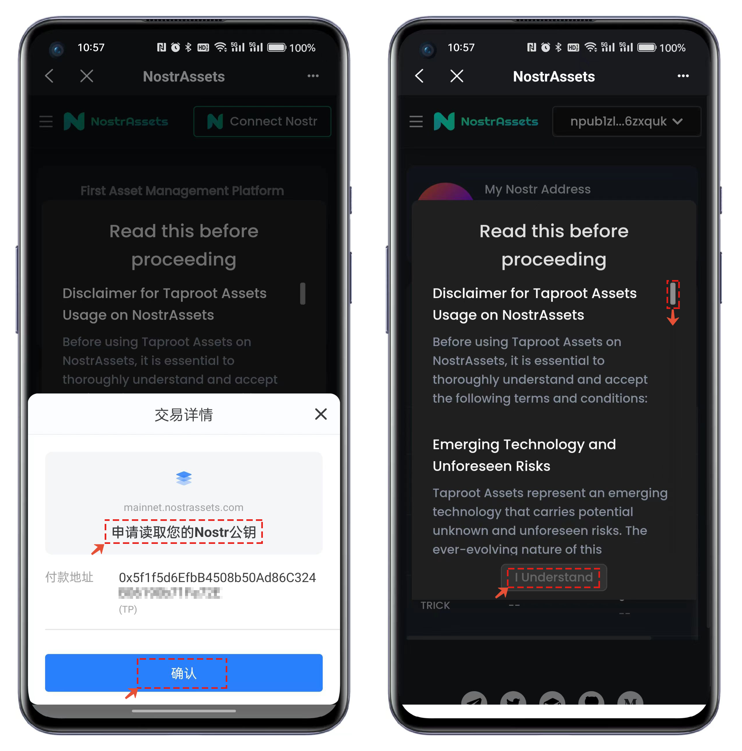2、首次使用需要Nostr公钥的获取签名，点击【确认】后阅读提示内容，完成阅读后点击【I Understand】。