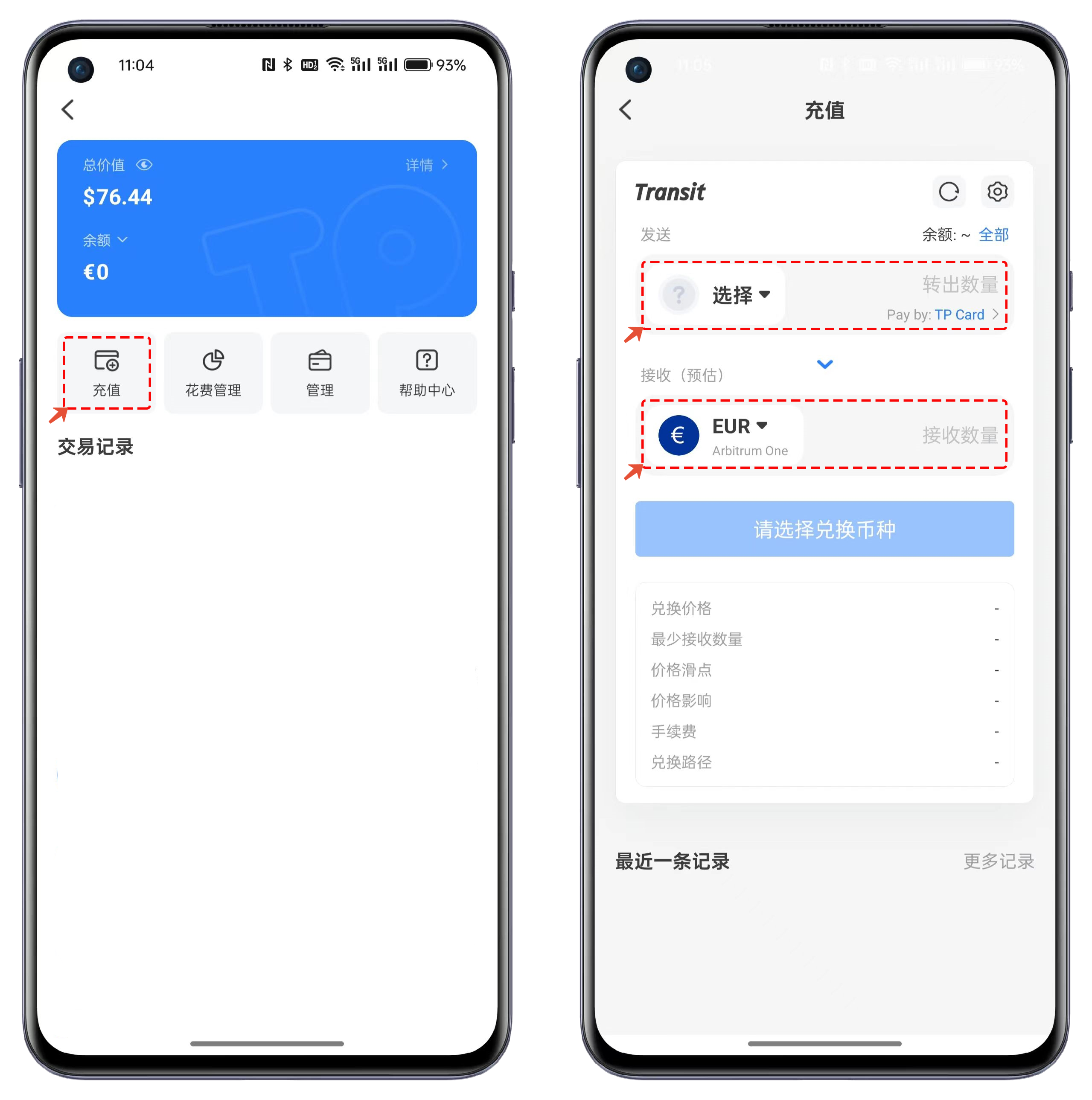 2、打开 TP Card 后,点击 [充值] 菜单,弹出的充值界面中可以选择转出网络、转出代币和数量。