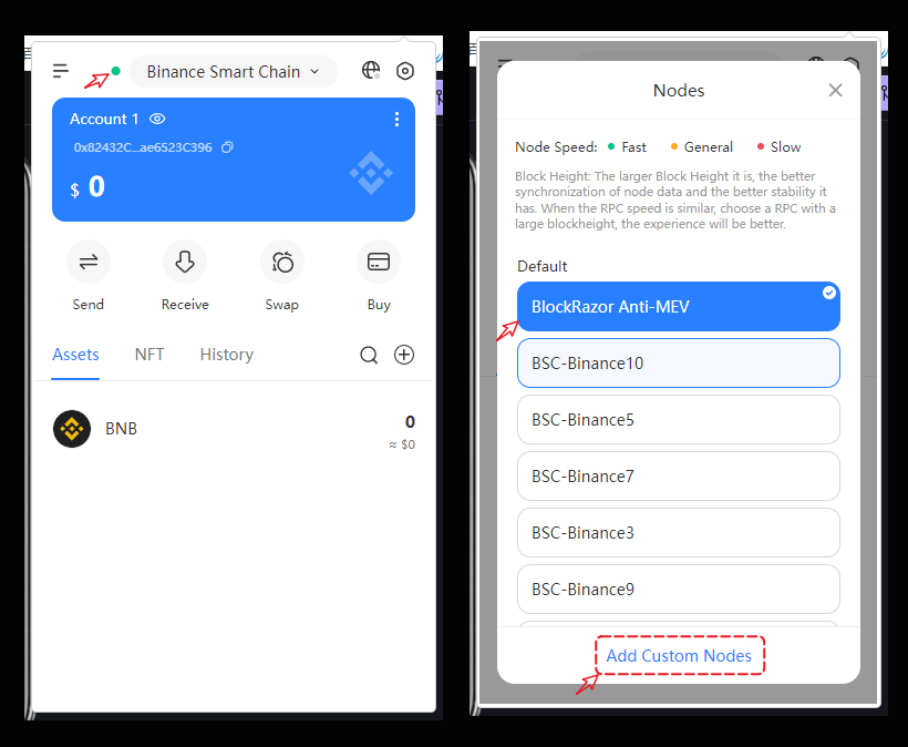 Open the TokenPocket plugin wallet, click the small circle in the upper left corner, and in the node list, you will see nodes that include "MEV," which are equipped with anti-MEV functionality. You can also click "Add Custom Node" at the bottom to use third-party trusted anti-MEV nodes.