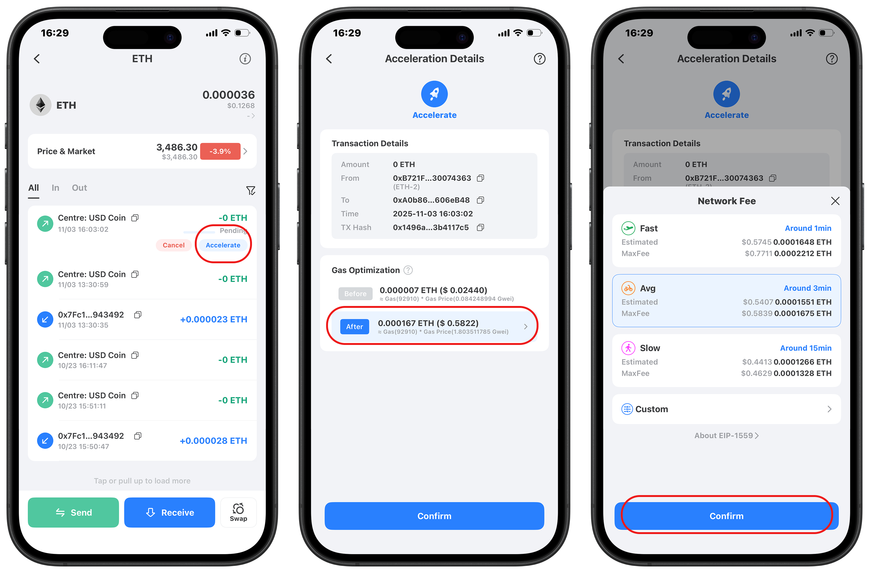 On the Accelerate page, TokenPocket will provide the best Gas fee for the user automatically. Users are able to complete the transaction by one-click, without having to adjust the number. Meanwhile, users are also allowed to accustom the Gas fee.