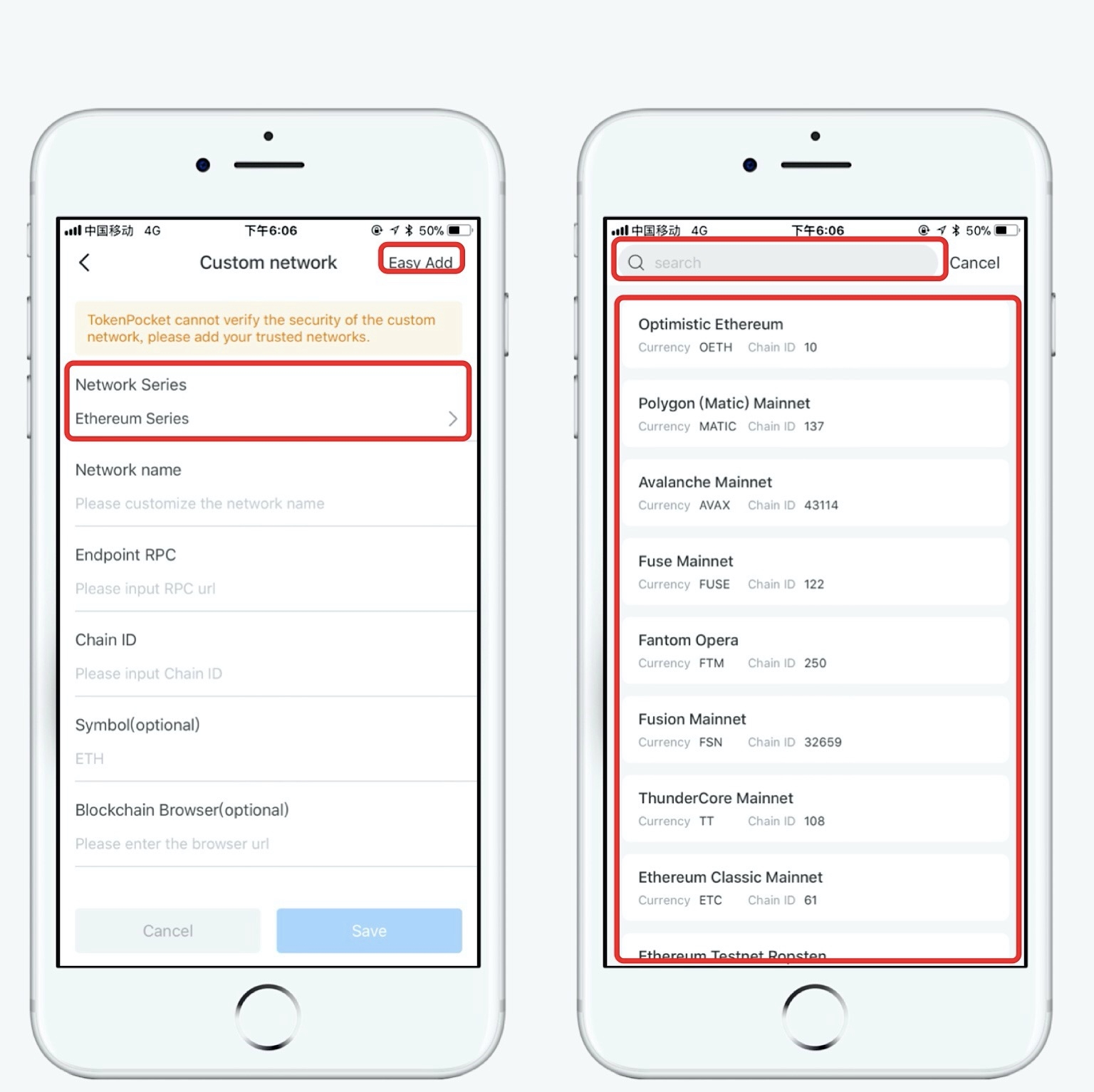 2. Custom network can set the required parameters by yourself, or you can click the [Easy Add] in the upper right corner to select the required network quickly, just search for Fantom at the top to view the information.