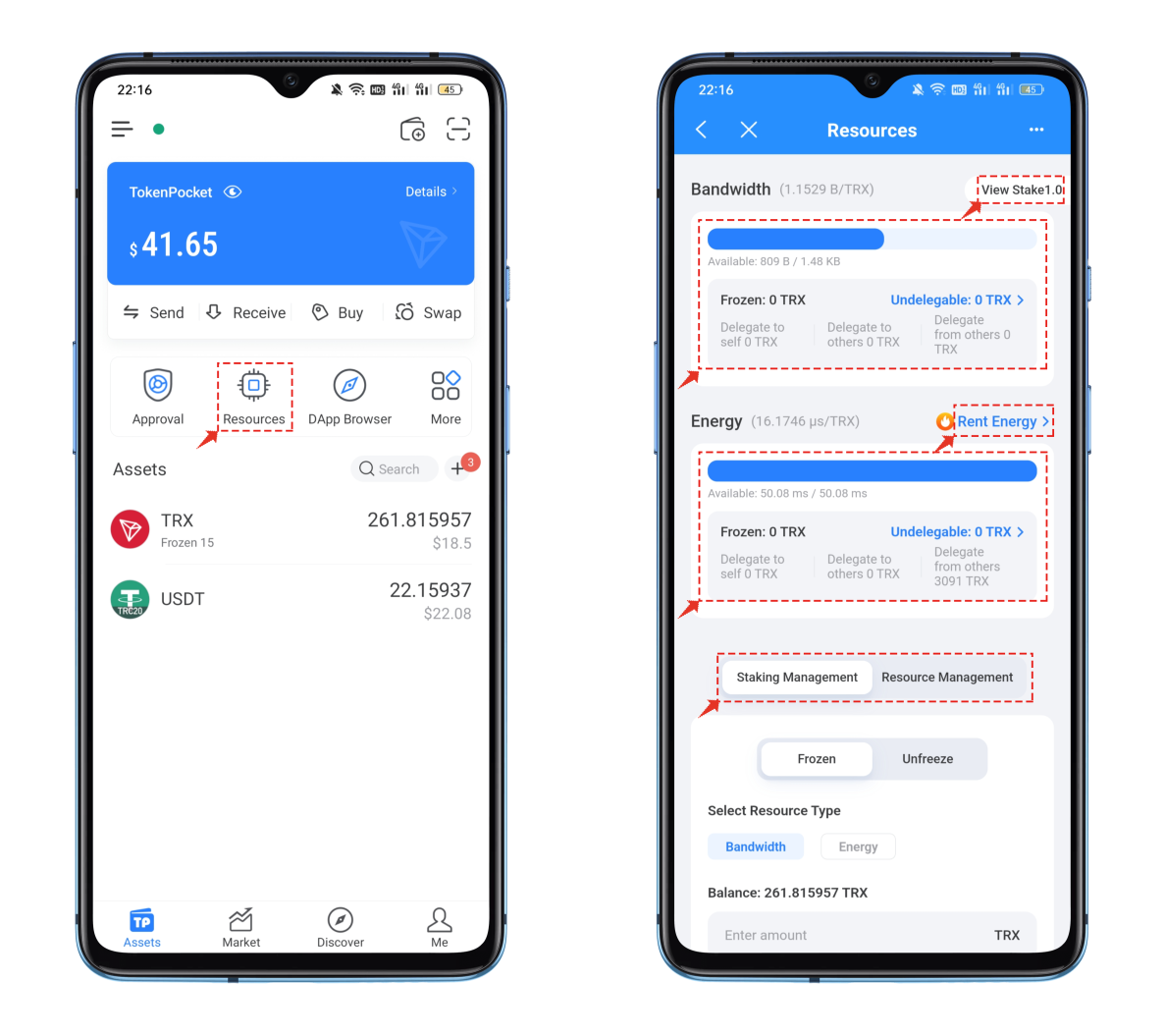 2\. Click on “Staking Management” to choose between “Freeze” and “Unfreeze” based on your actual bandwidth/energy needs.