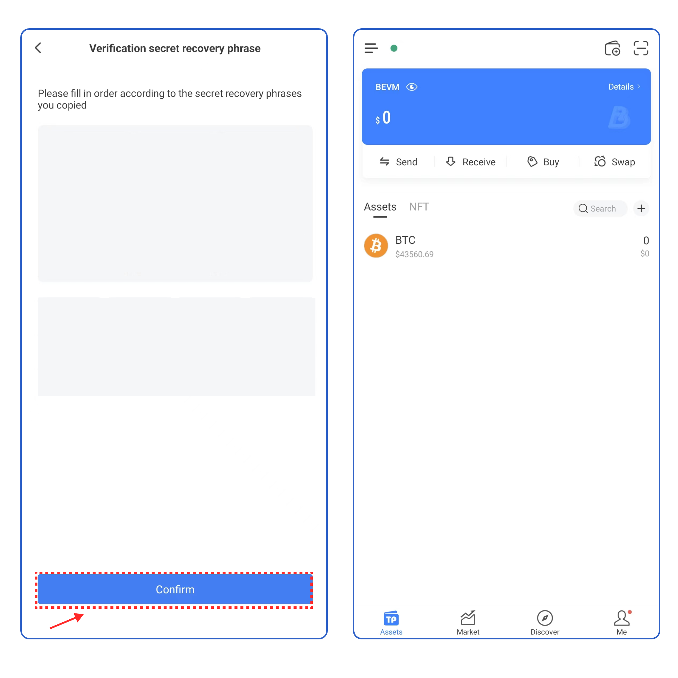 5\. Enter your secret recovery phrase, and click **\[Confirm].** At this point, you have successfully created a **BEVM** wallet.