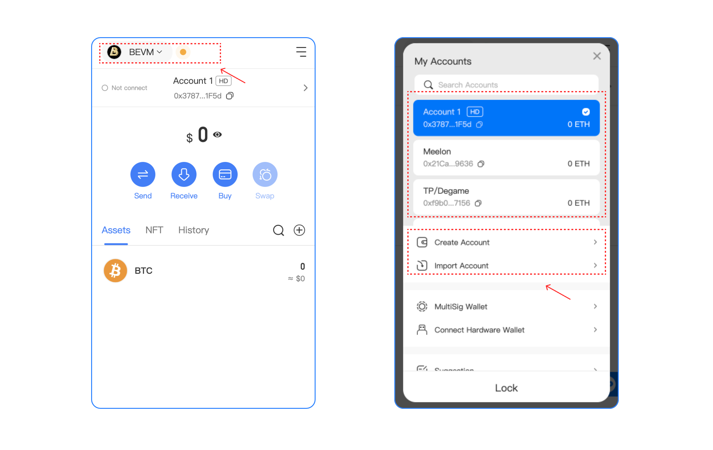 2. After you select, you can view your **BEVM** **Wallet** on the Assets page, click the upper right corner to access the management page, switch your wallet, and create/import your wallet on this page.