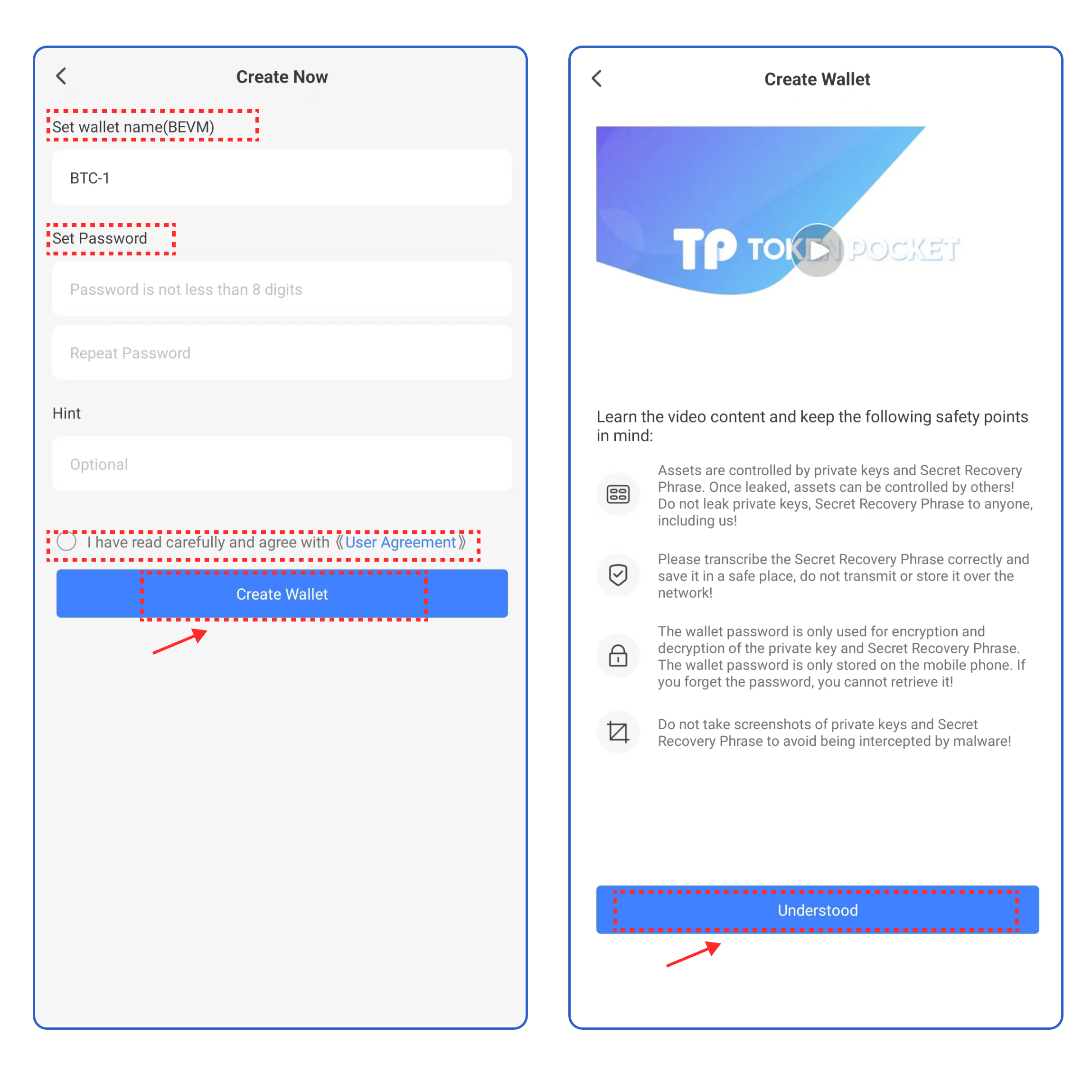3\. Set the wallet name and password, click the User Agreement, and click **\[Create Wallet].** Watch and learn the video content, click **\[Understood].**