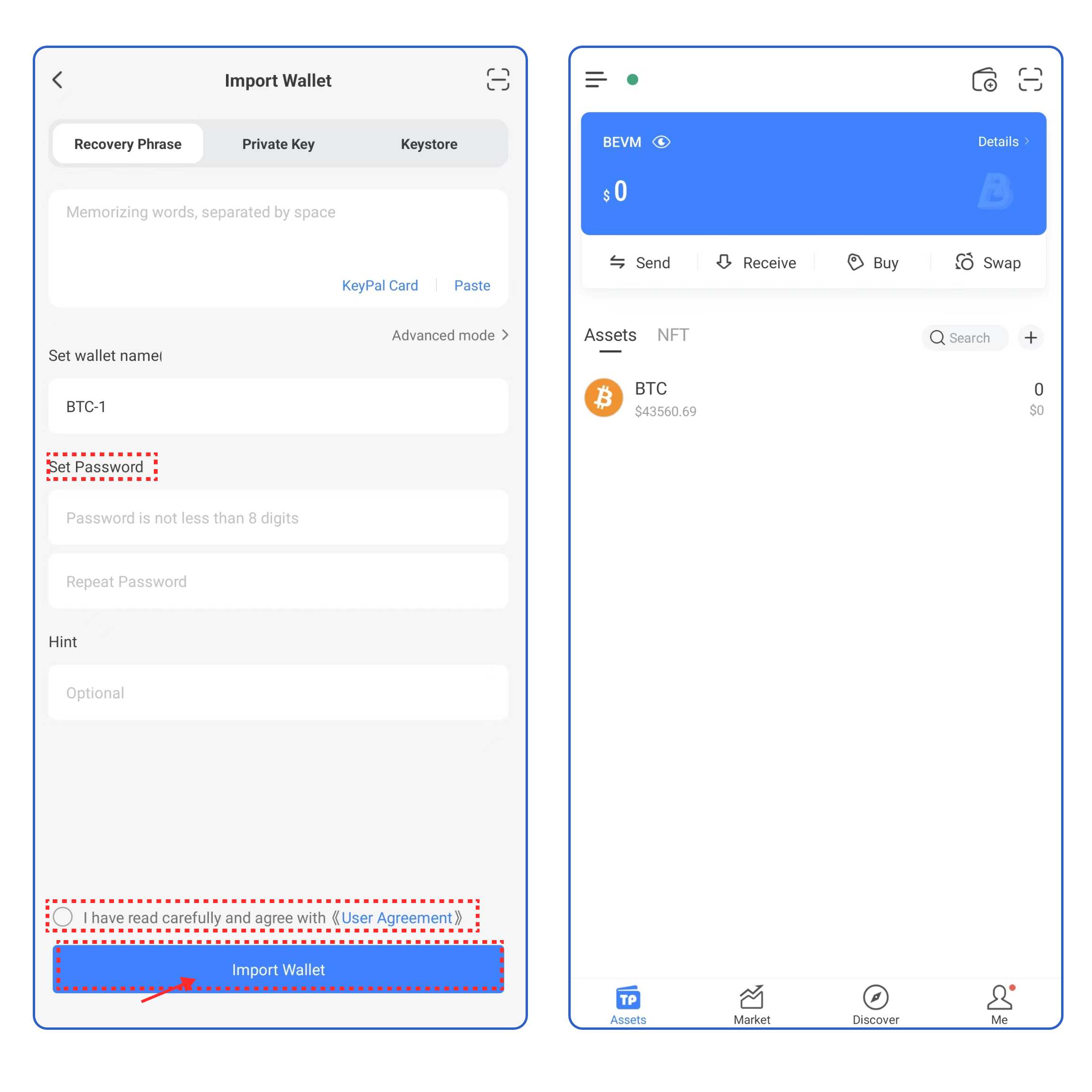 3\. Take **\[Recovery Phrase import]** as an example, enter your secret recovery phrase, wallet name, and password, click the User Agreement, and click **\[Import Wallet]**. At this point, you have successfully imported a **BEVM** wallet.​​