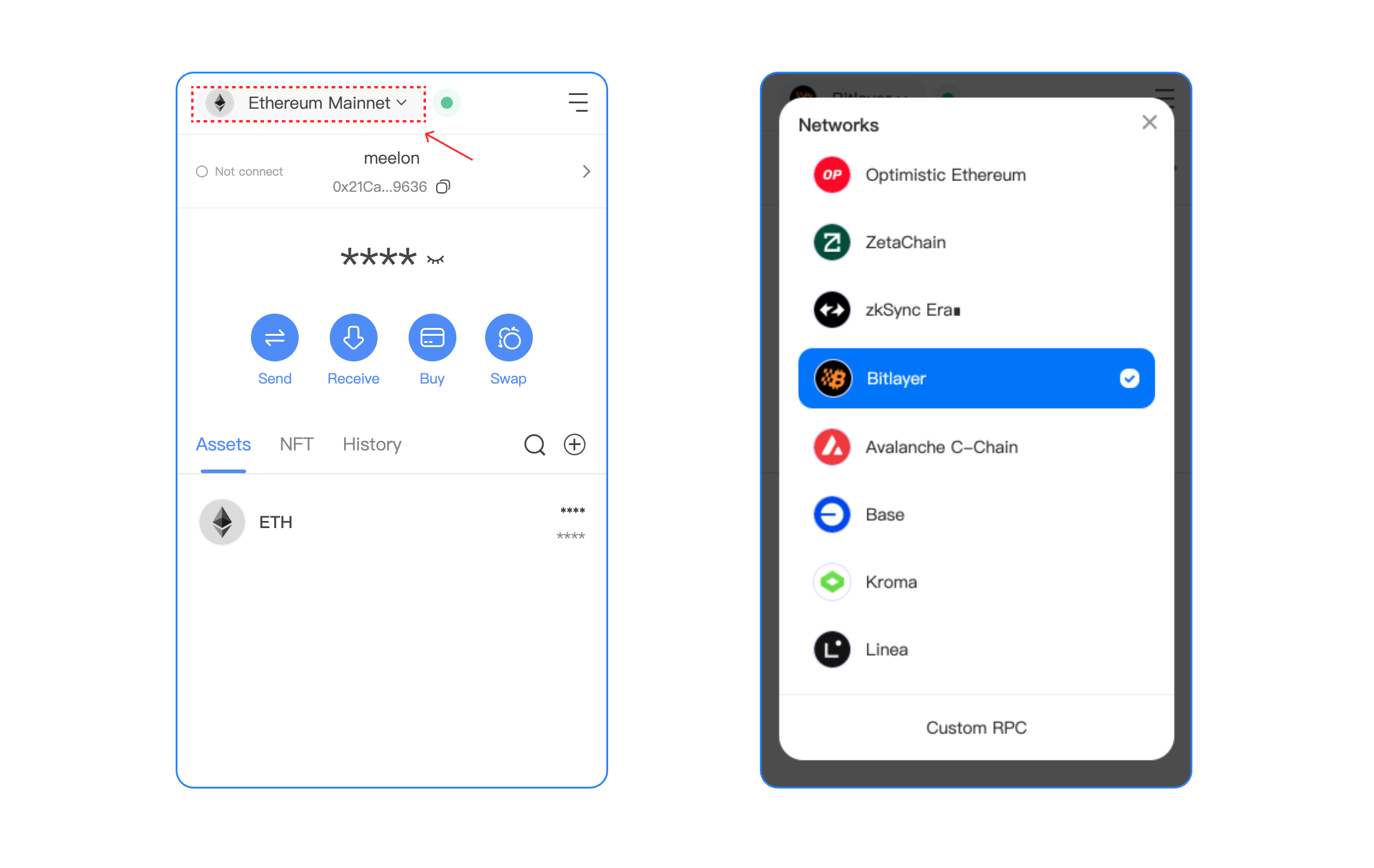 1. Open TokenPocket Chrome Extension, and click the upper left corner to select the **Bitlayer Network**.