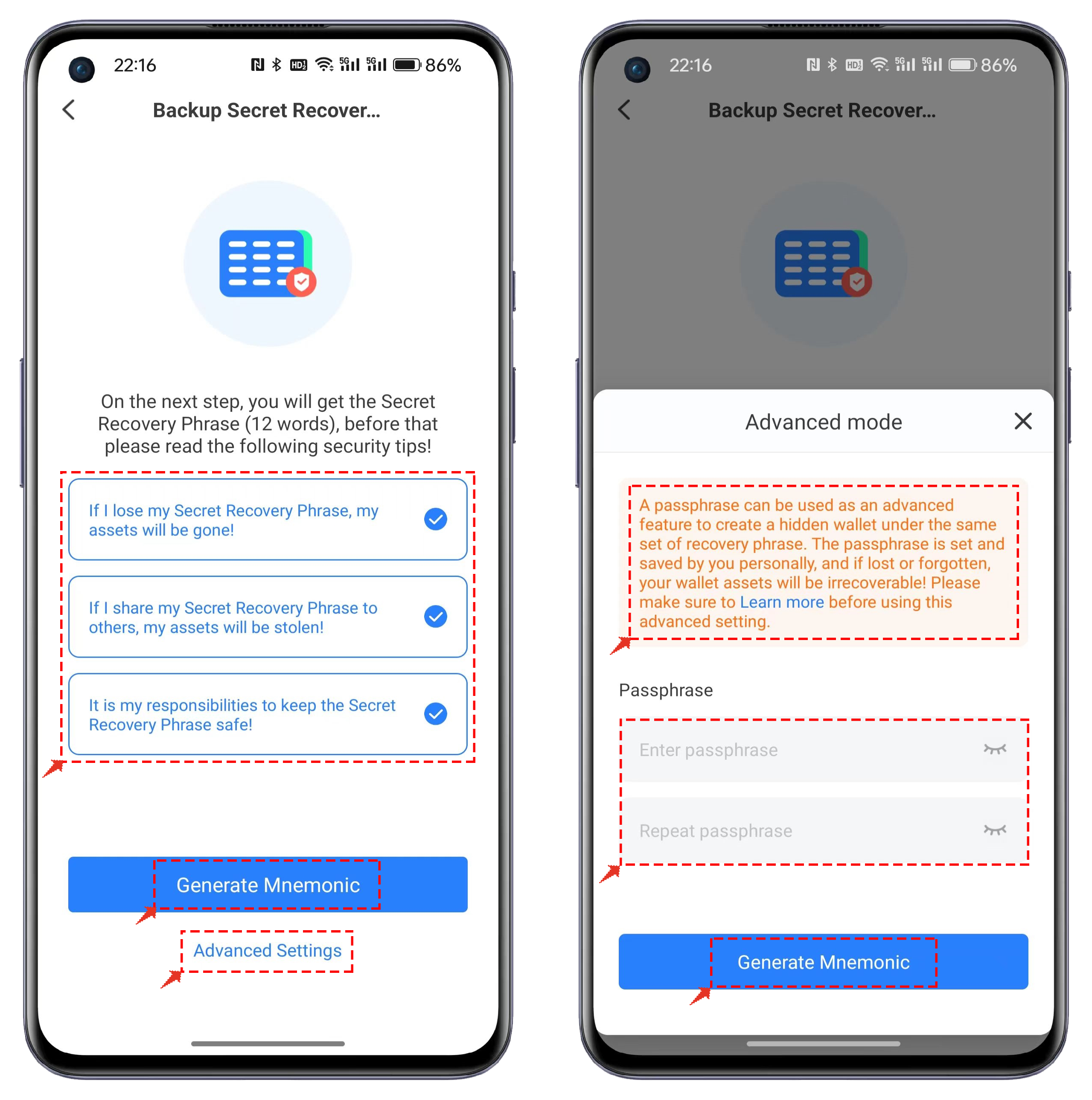 3. The backup mnemonic function is consistent with the creation of wallets on other public chains. It's important to note that clicking on "Advanced Settings" allows you to create a wallet using the Passphrase method. For this type of wallet, it is essential to use the correct mnemonic + the correct password to import the correct wallet address.