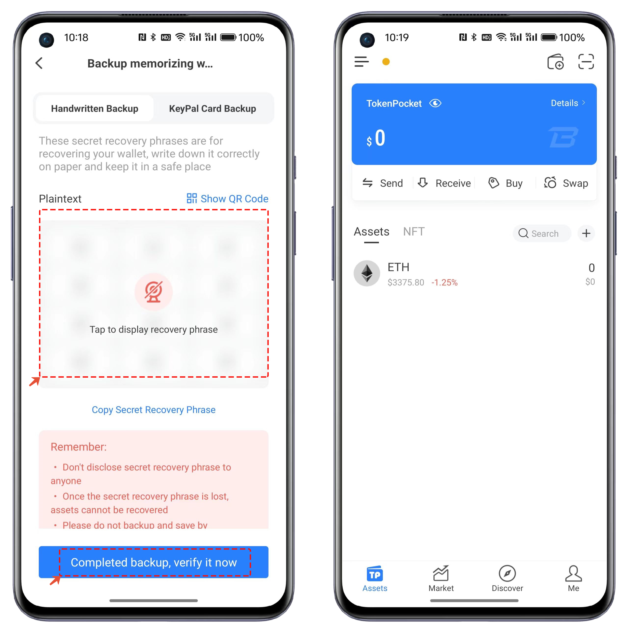 4. Be sure to use an offline method to back up the mnemonic phrase, and avoid loss or leakage. If the wallet was created using the Passphrase method, remember your mnemonic phrase and the set passphrase. Once the verification of the mnemonic phrase is complete, you can create a Blast wallet.