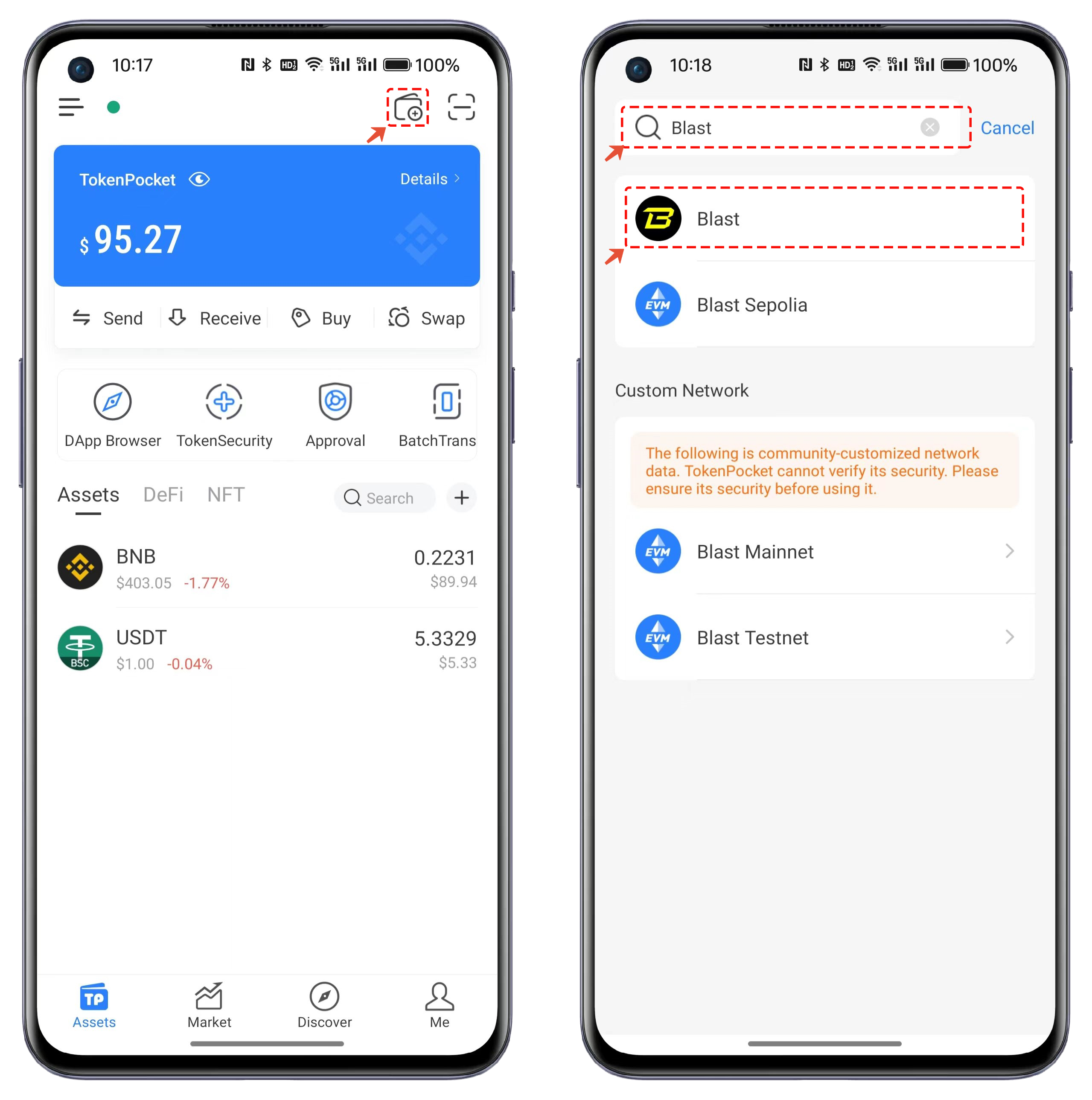 1. Open TokenPocket, click on the top right corner to add a wallet, search and select Blast  from the list;