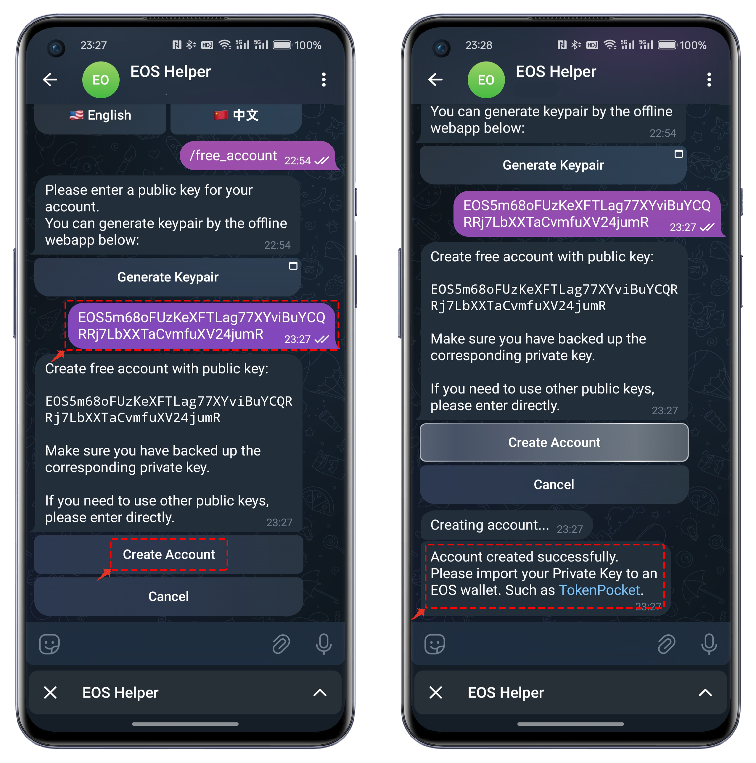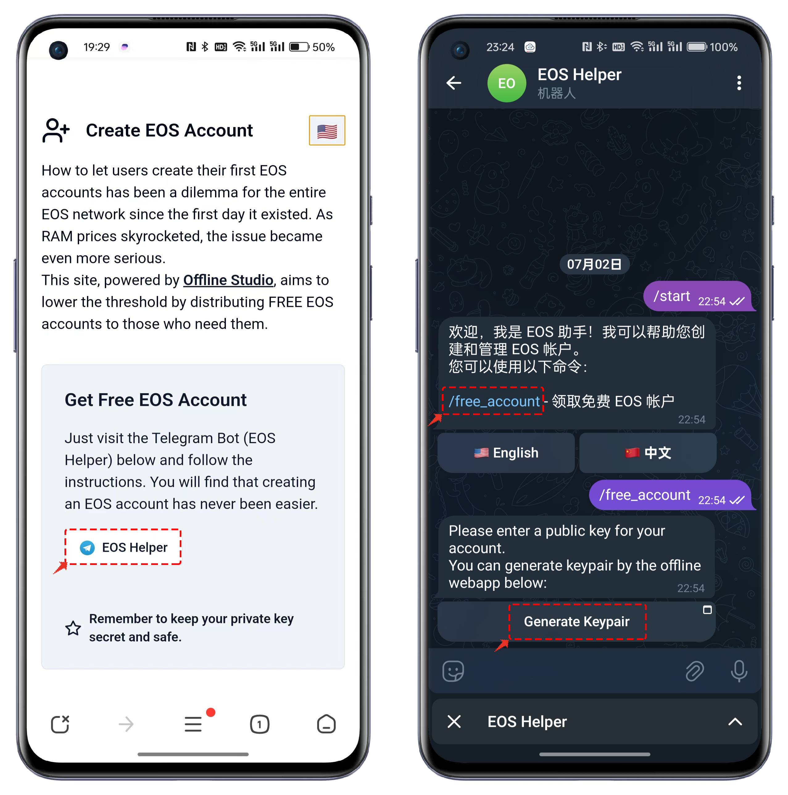 1. Open the link for free EOS account creation: <https://eoshelper.pages.dev/>. After opening the link, click on \[EOS Helper] on the interface. You will be automatically prompted to open the EOS Helper bot via Telegram. The interface supports both Chinese and English. Click on \[/free\_account], and a prompt will appear. Here, you can directly enter your EOS public key address to create the account. If you do not have a public key address, continue by clicking on \[Generate Keypair] to create a new public/private key pair through the webpage.