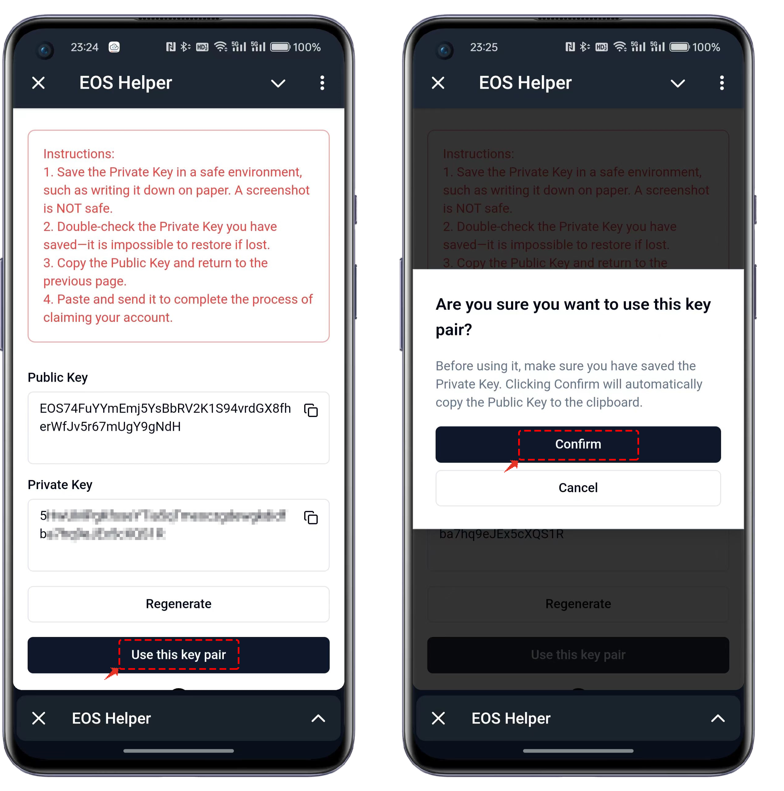 2\. On the opened page, the key starting with EOS is the public key, and the one starting with 5 is the private key. Be sure to securely store the private key content offline. You can click on \[Regenerate] below to replace the key pair with a new set. Click on \[Use this key pair] to proceed to the next step. In the pop-up interface, you will be prompted to confirm whether you need this key pair, and the public key will be automatically copied to the clipboard. If you are sure, click on \[Confirm].