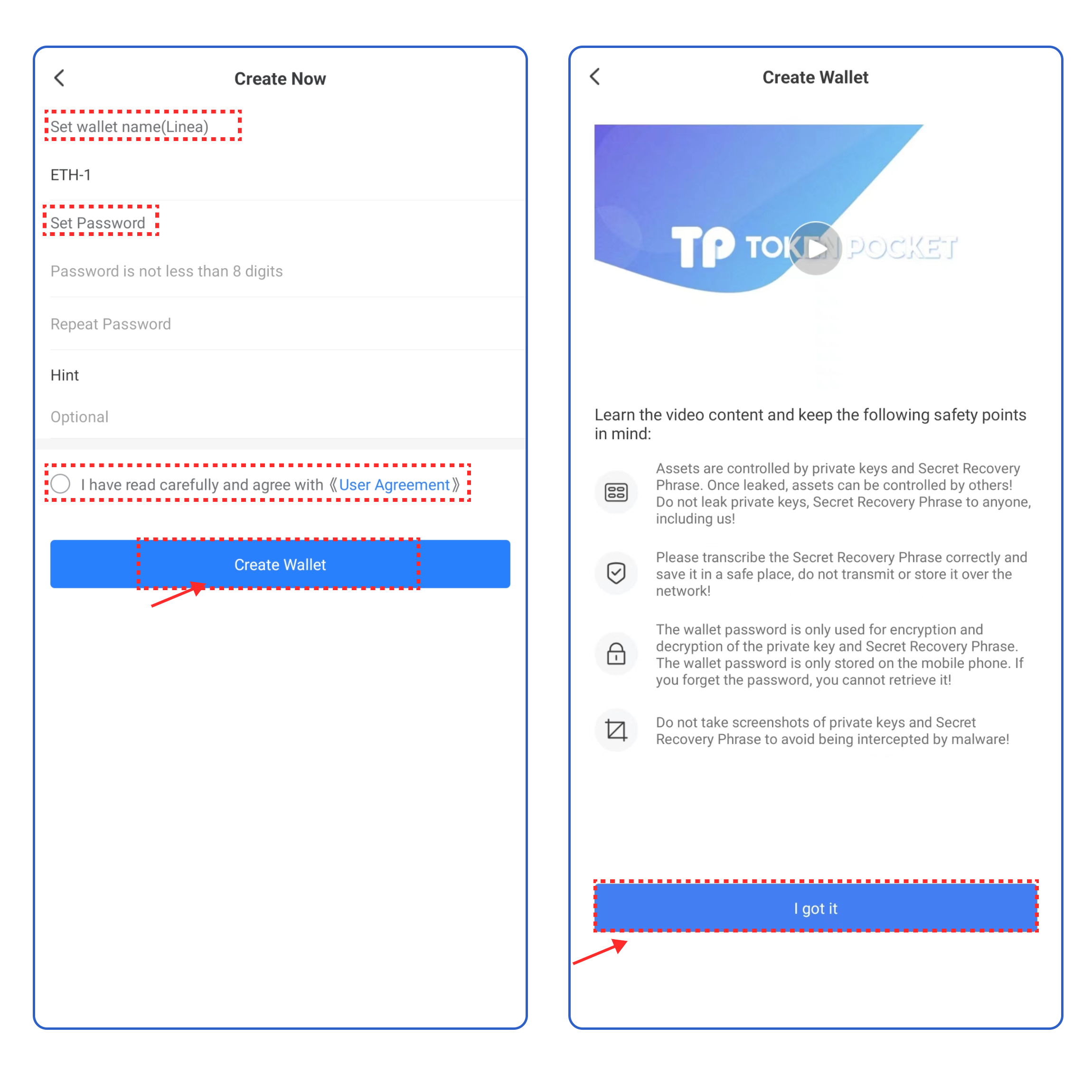3\. Set the wallet name and password, click the User Agreement, and click **\[Create Wallet].** Watch and learn the video content, click **\[I got it].**