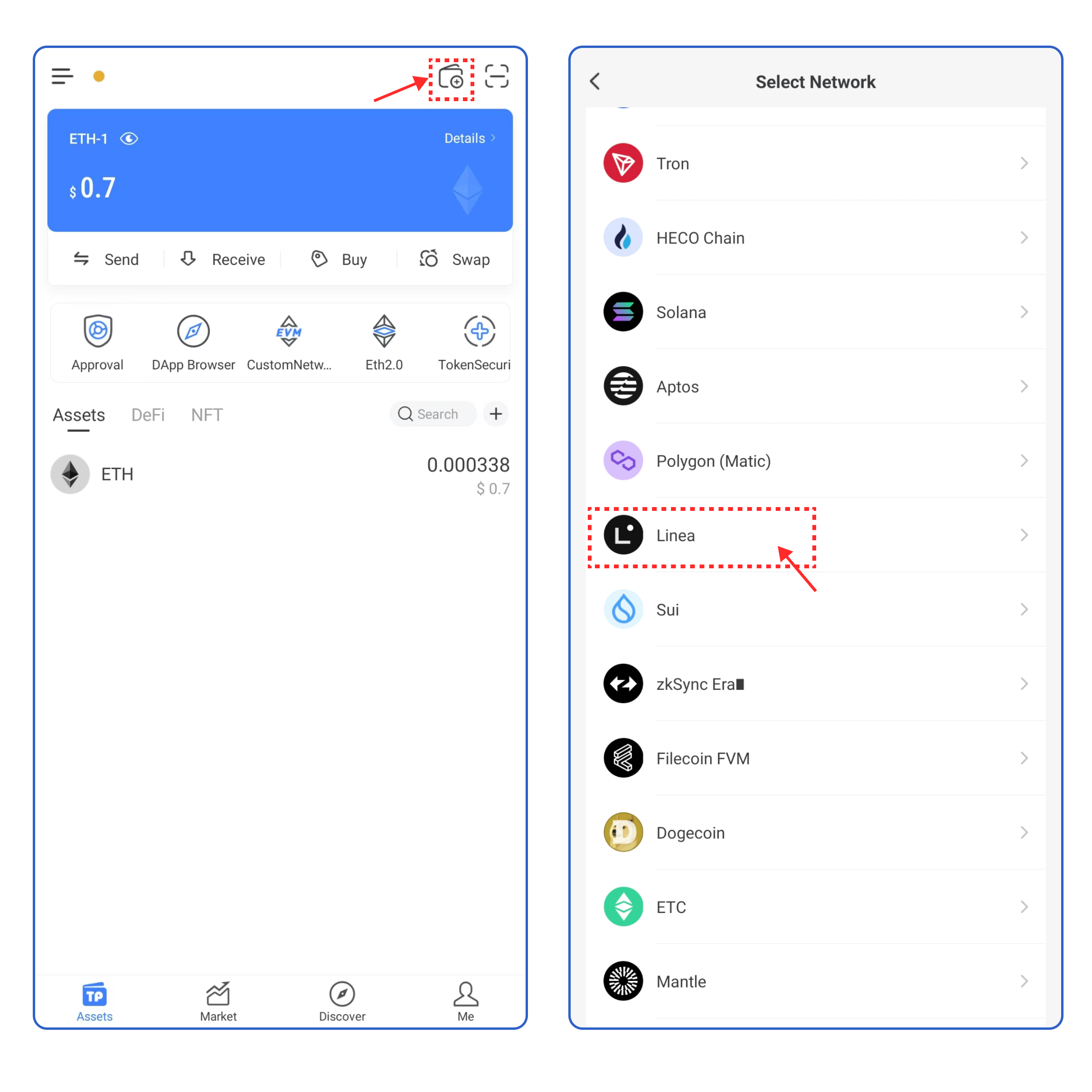1. Open TokenPocket APP, click![](https://2516903027-files.gitbook.io/~/files/v0/b/gitbook-x-prod.appspot.com/o/spaces%2F-MMJyYRLFVRsMrfcXuRV%2Fuploads%2FURwrKk5aqL1DfK7y6JTH%2Fimage.png?alt=media\&token=089afde0-3200-4772-8125-ae1115af592e) on the upper right corner, and select **Linea;**