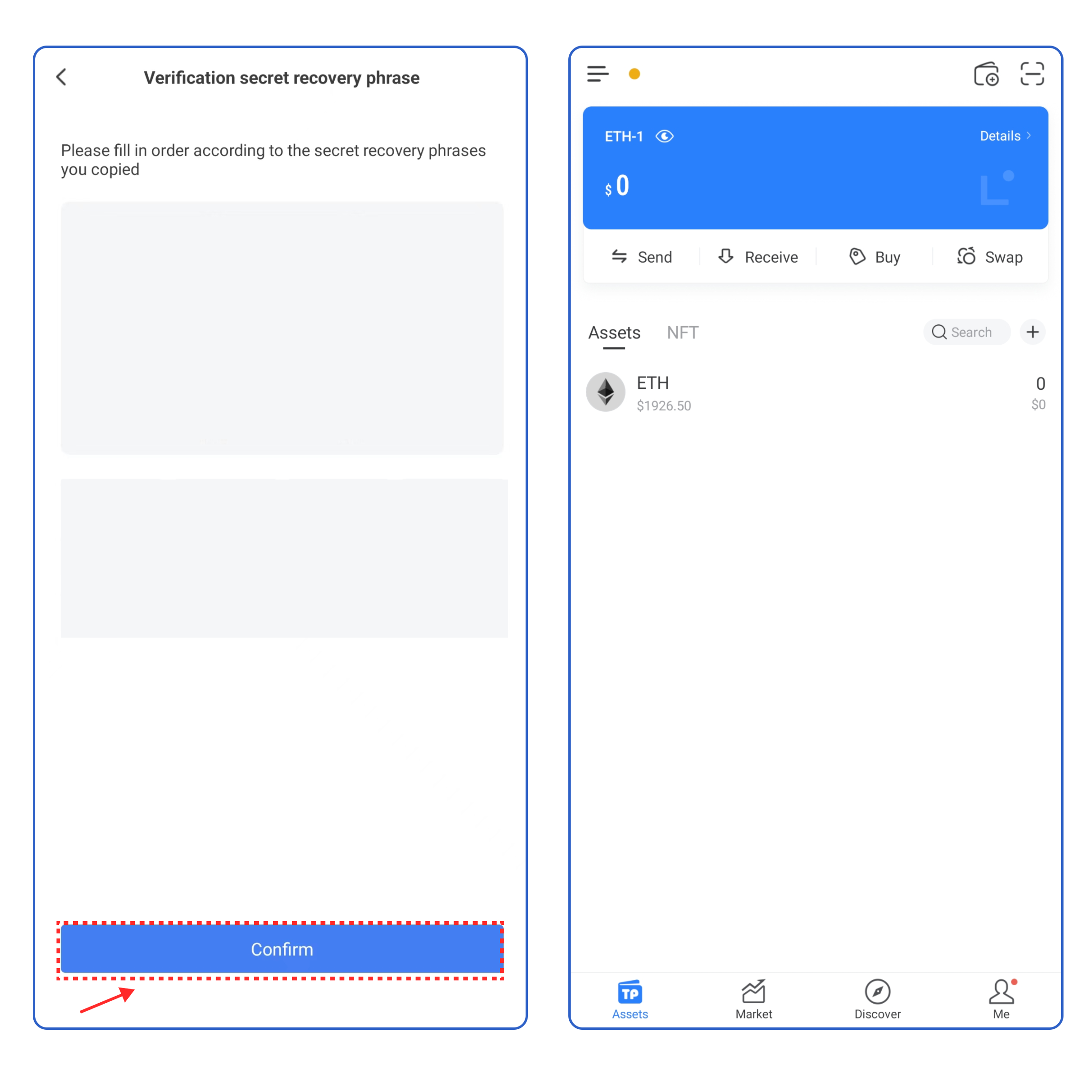 5\. Enter your secret recovery phrase, and click **\[Confirm].** At this point, you have successfully created a **Linea** wallet.