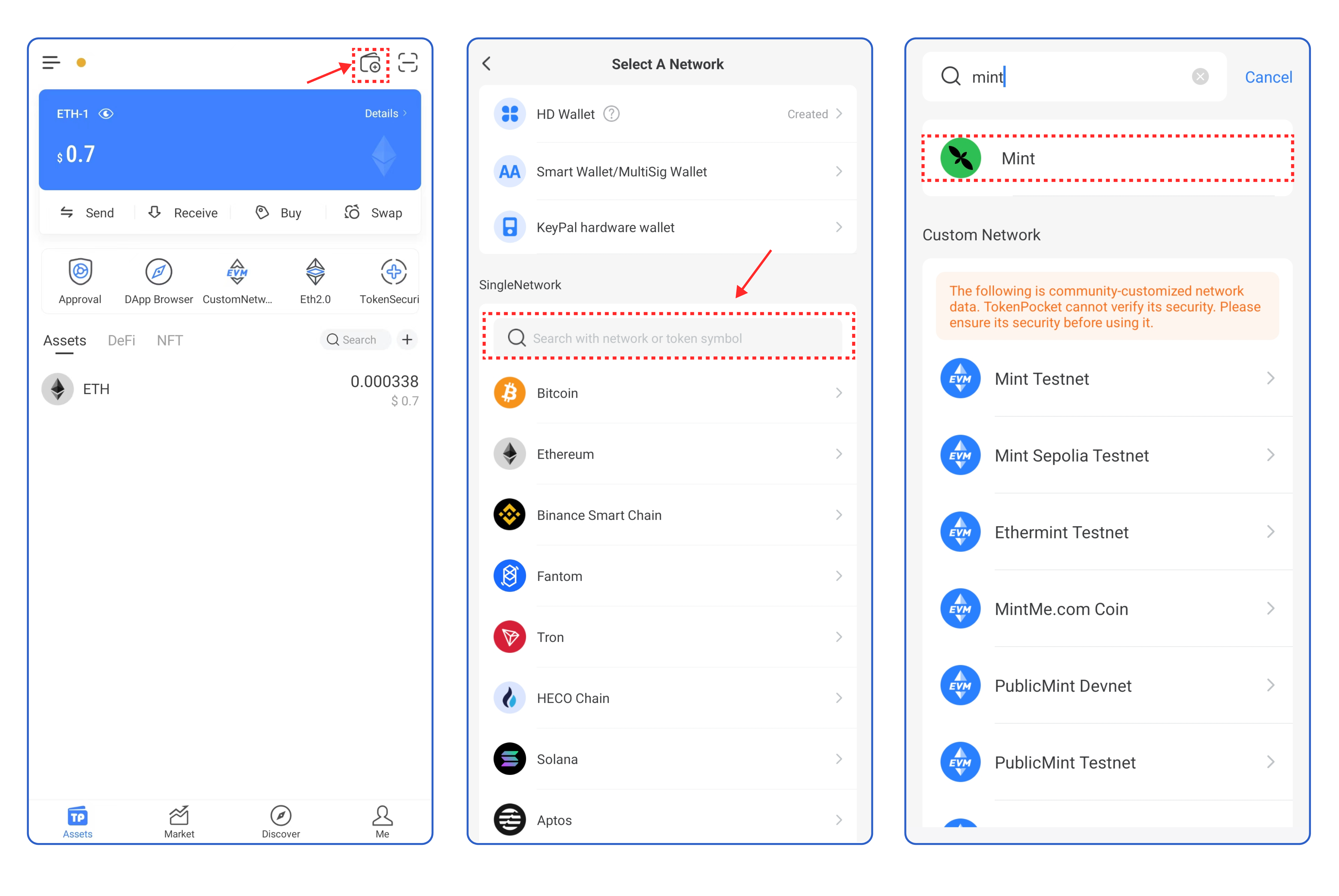 1. Open the TokenPocket APP, click ![](https://659607907-files.gitbook.io/~/files/v0/b/gitbook-x-prod.appspot.com/o/spaces%2F-MMJyYRLFVRsMrfcXuRV%2Fuploads%2FUjYAAs2G6BZ8CNsYXCiH%2Fimage.png?alt=media\&token=9adac656-510e-4346-8334-d99ad71f1417) on the upper right corner, click the search bar, and enter **Mint**;&#x20;