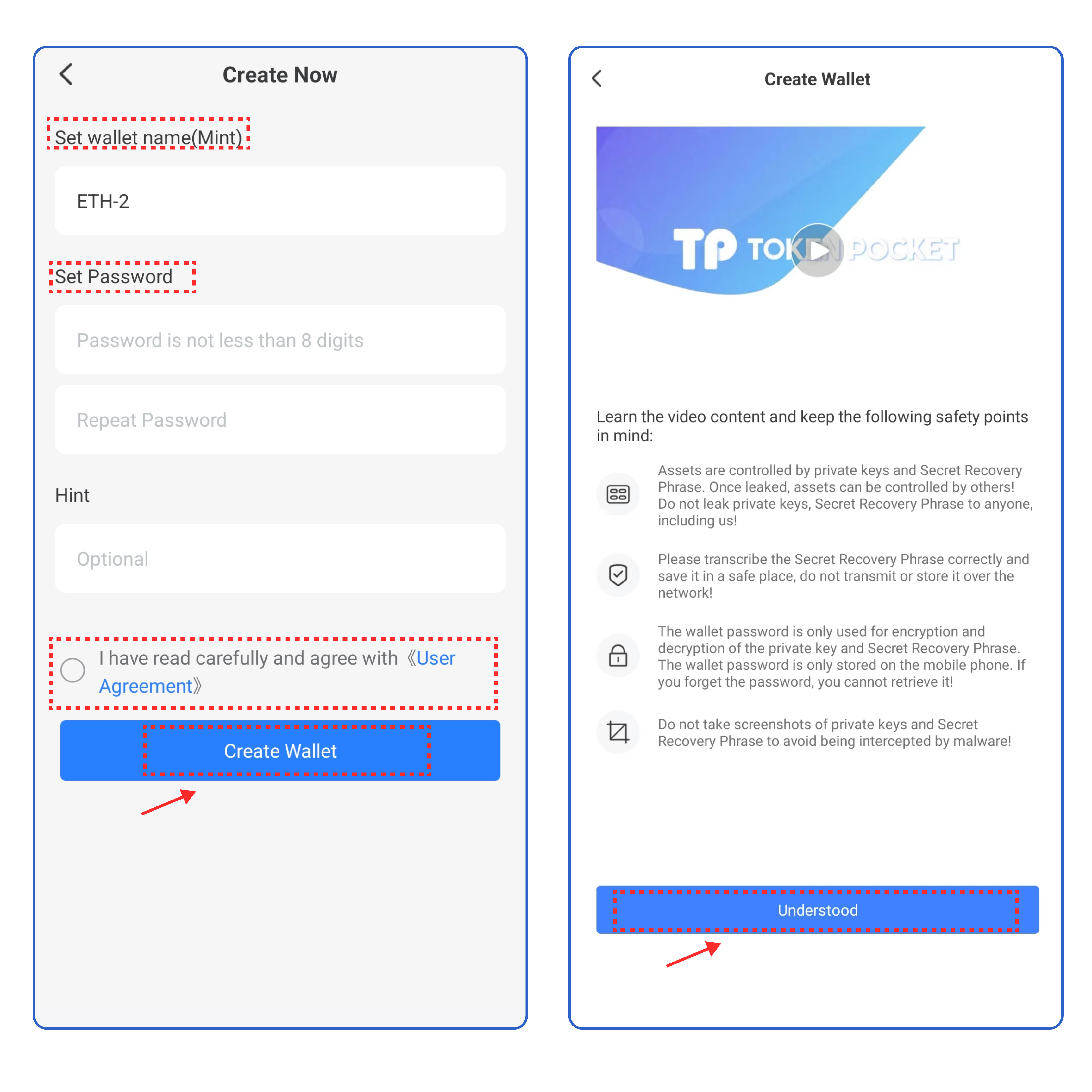3\. Set the wallet name and password, click the User Agreement, and click **\[Create Wallet].** Watch and learn the video content, click **\[Understood].**