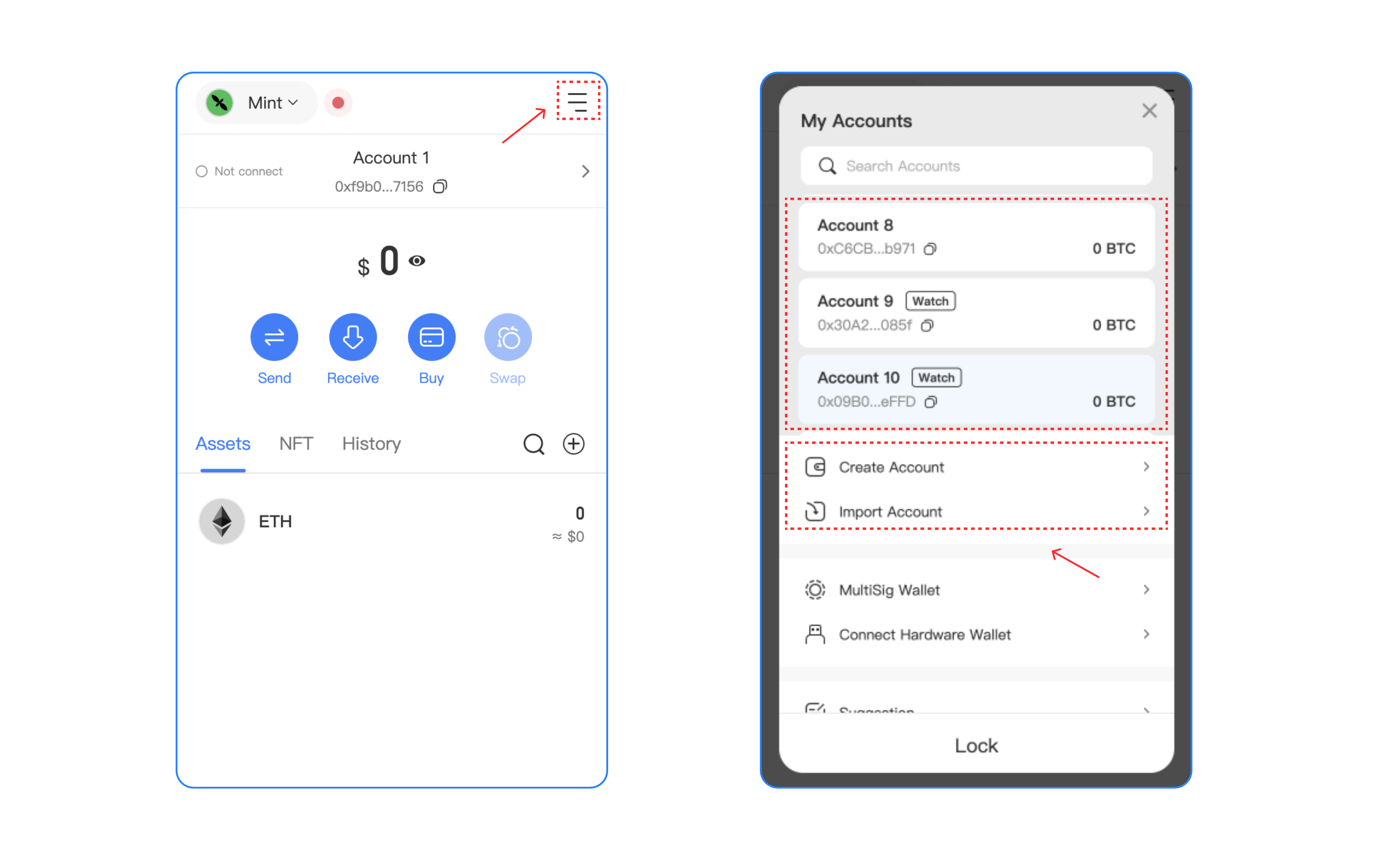 2. After you select, you can view your **Mint** **Wallet** on the Assets page, click the upper right corner to access the management page, you can switch your wallet, and create/import a wallet on this page.