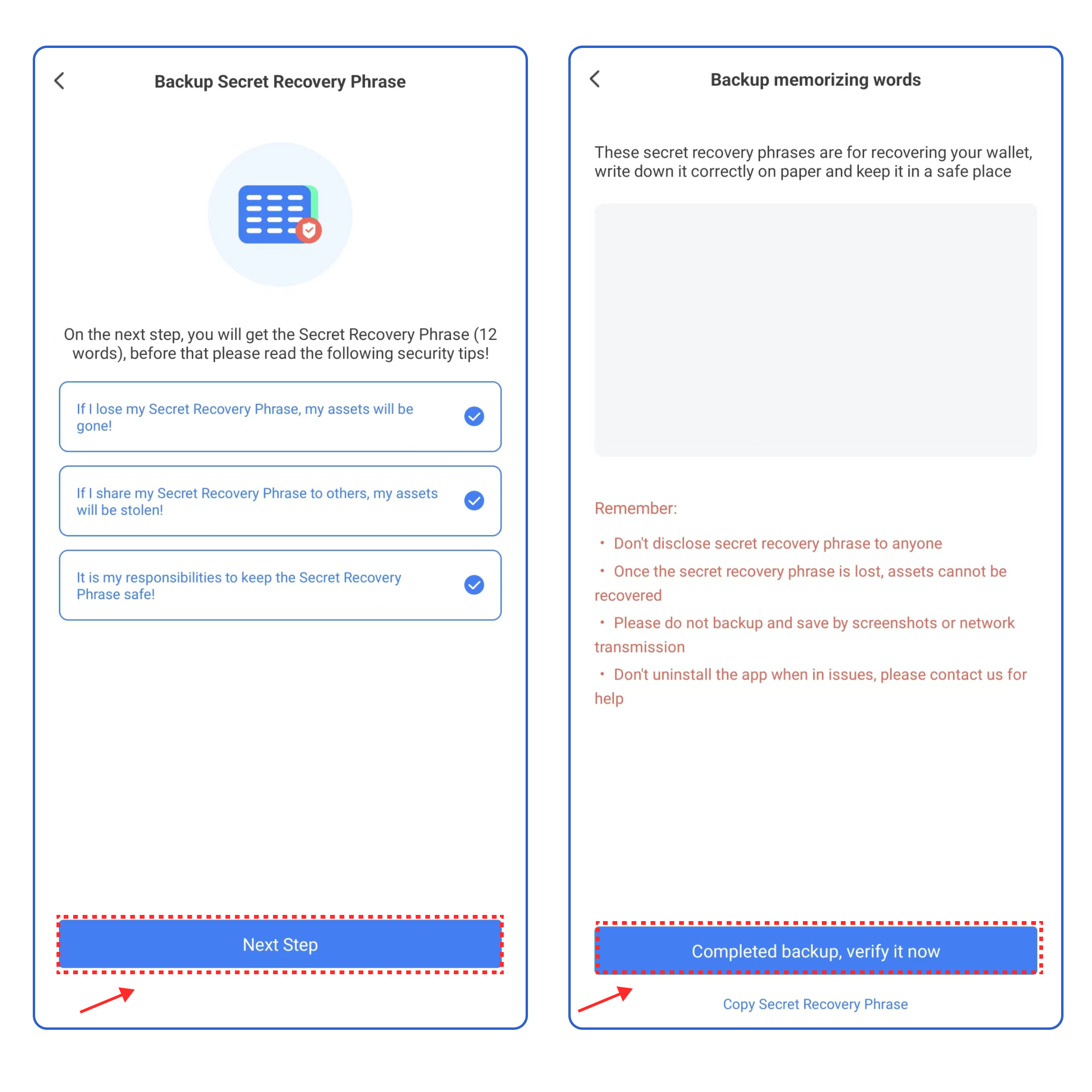 4\. Select the security tips, and click **\[Next Step]**. Back up the secret recovery phrase on the paper or on the [**KeyPal**](https://www.keypal.pro/en/), and store it in a safe place. Click **\[Completed backup, verify now]** .