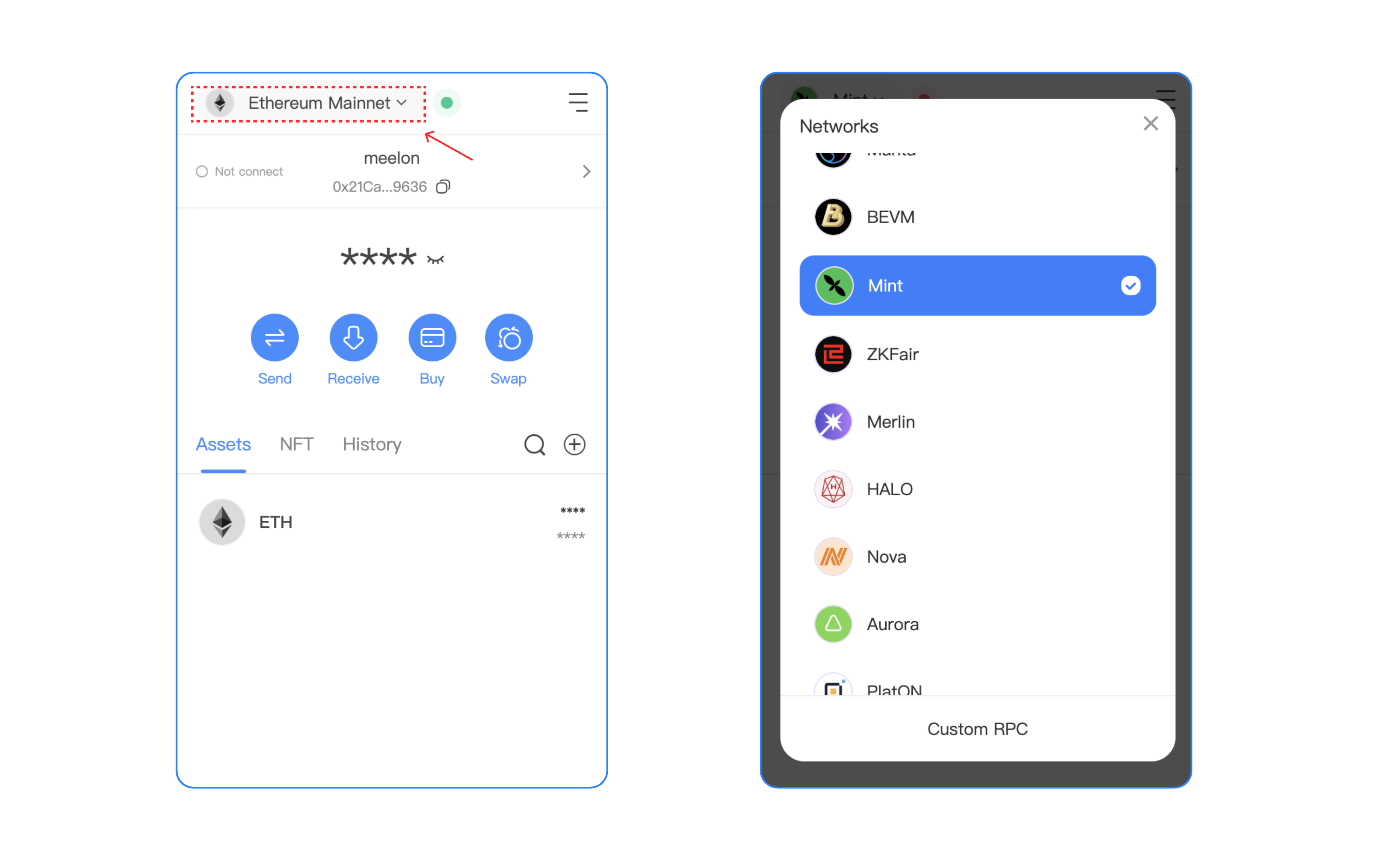 1. Open TokenPocket Chrome Extension, and click the upper left corner to select the **Mint Network**.