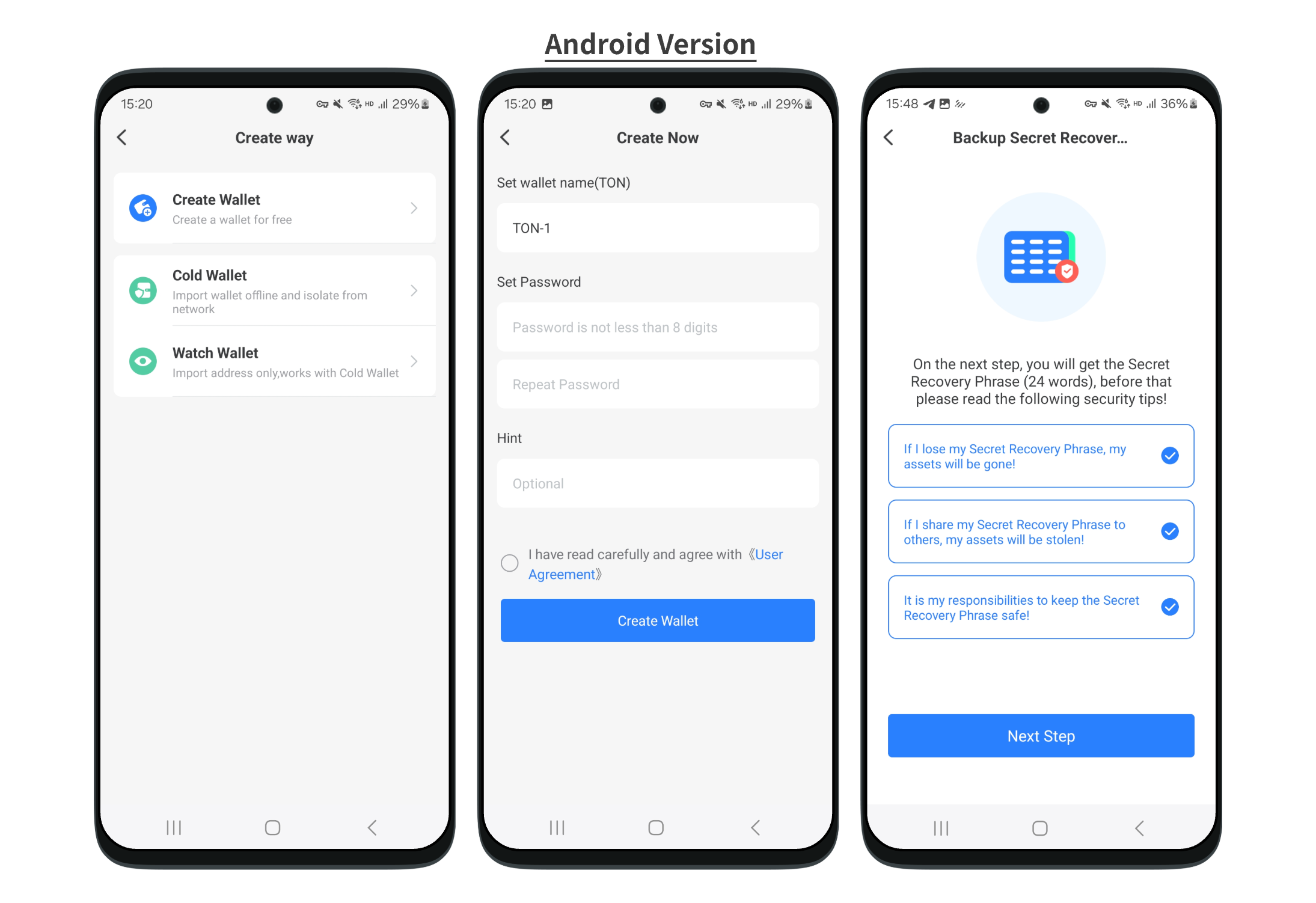 2. <mark style="color:purple;">>Android Version.</mark> Click **\[TON]** and click **\[Create Wallet]** after the 1st step, then set your wallet name, password, and so on. Follow the steps below.