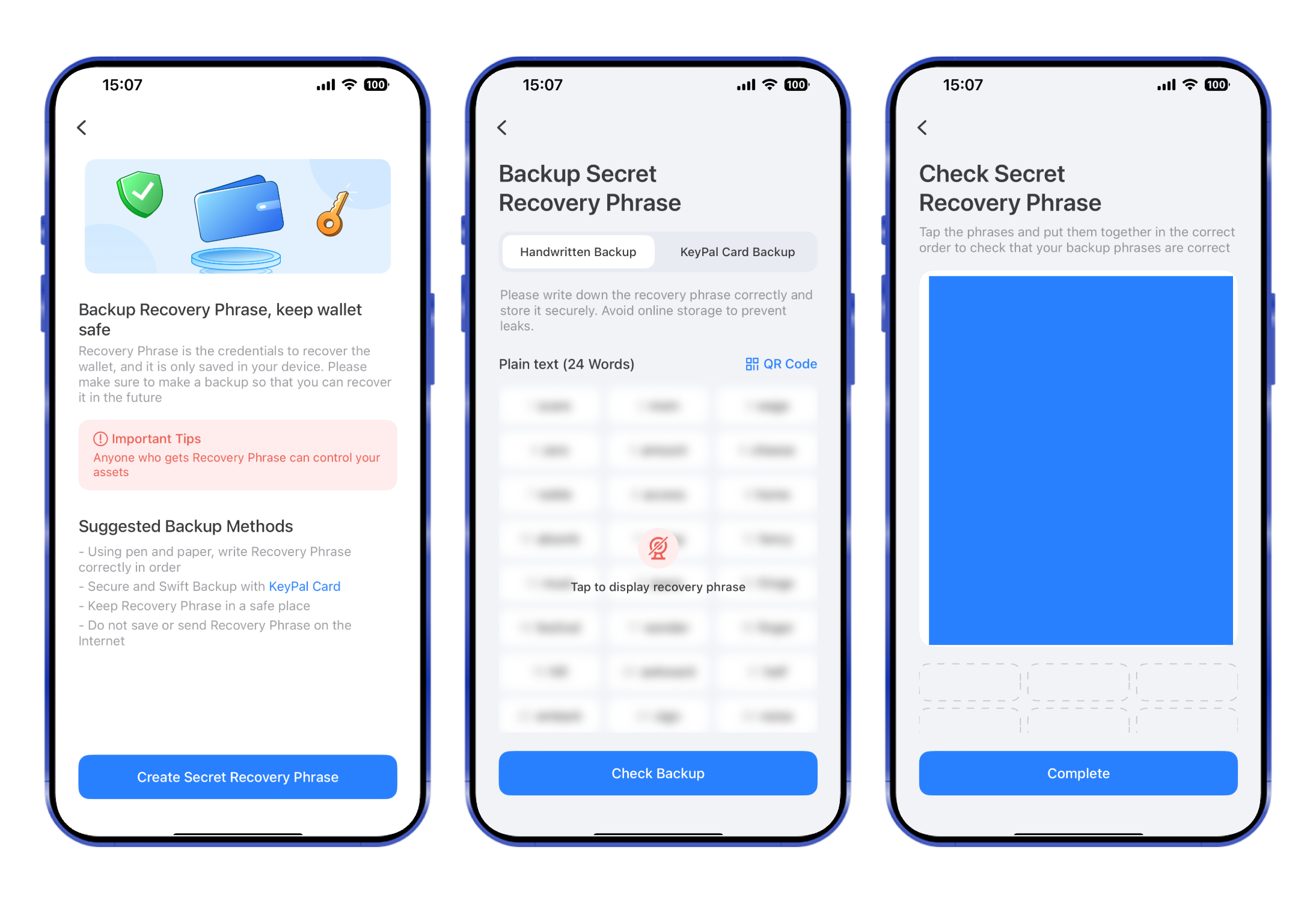 3. Back up the secret recovery phrase on the paper, and store it in a safe place. Click **\[Completed backup]**  and verify your secret recovery phrase.